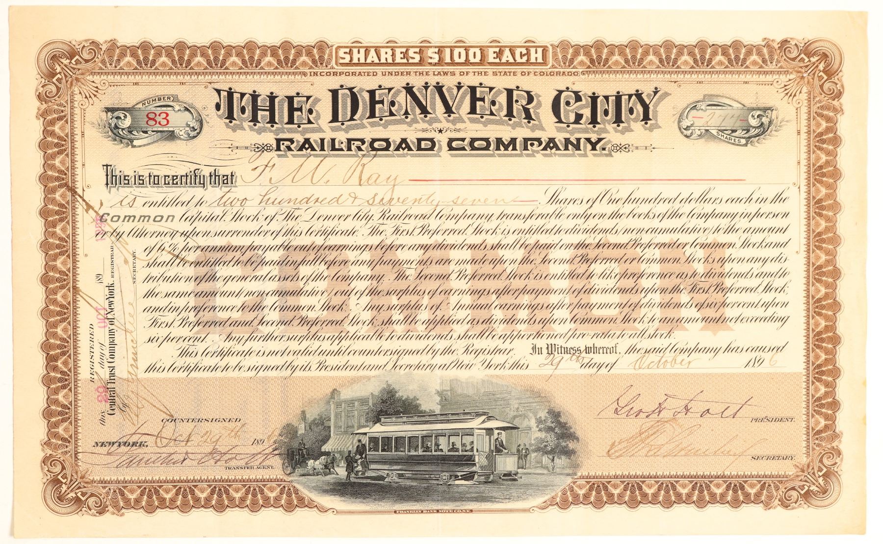 Stock Certificate from the Denver City Railroad Co. Certificate number 83 issued in 1896 to F.M. Ray\. Signed by president holt. Printed by Franklin Bank Note Co., N.Y. Size 11.5 by 7 inches. In nice condition. Not cancelled. Trolley vignette. This was the 1893 reorganization of the Denver City Cable Railway Company. Sold under foreclosure in 1898 and purchased by the Denver City Traction Company. [History of Denver, Smiley]
