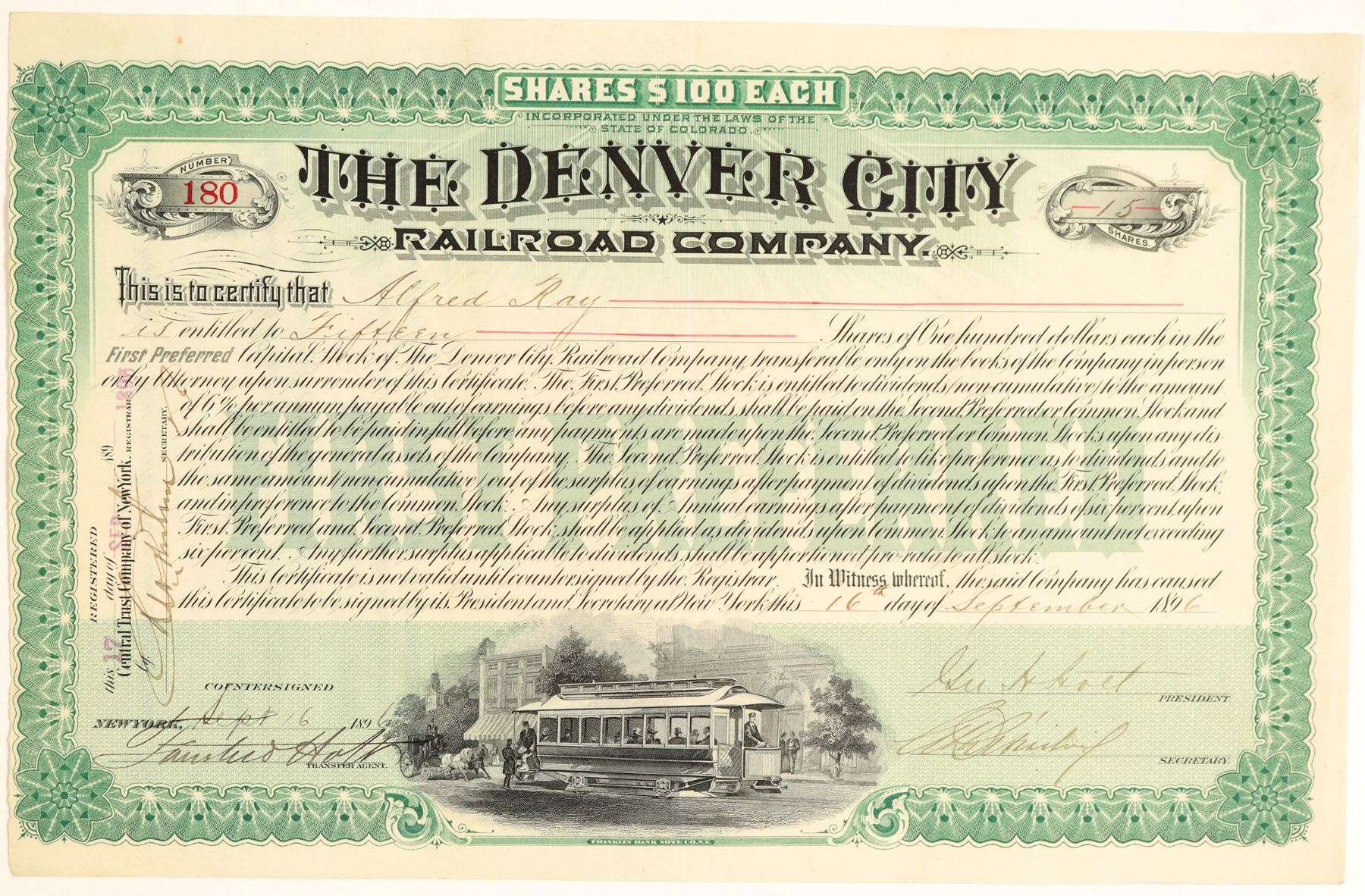 Stock Certificate from the Denver City Railroad Co. Certificate number 180 issued in 1896 at New York to Alfred Ray. Signatures on safety paper and hard to read. Printed by Franklin Bank Note Co., N.Y. Size 11 by 7 inches. In nice condition, Not Cancelled. Trolley vignette. This was the 1893 reorganization of the Denver City Cable Railway Company. Sold under foreclosure in 1898 and purchased by the Denver City Traction Company. [History of Denver, Smiley]