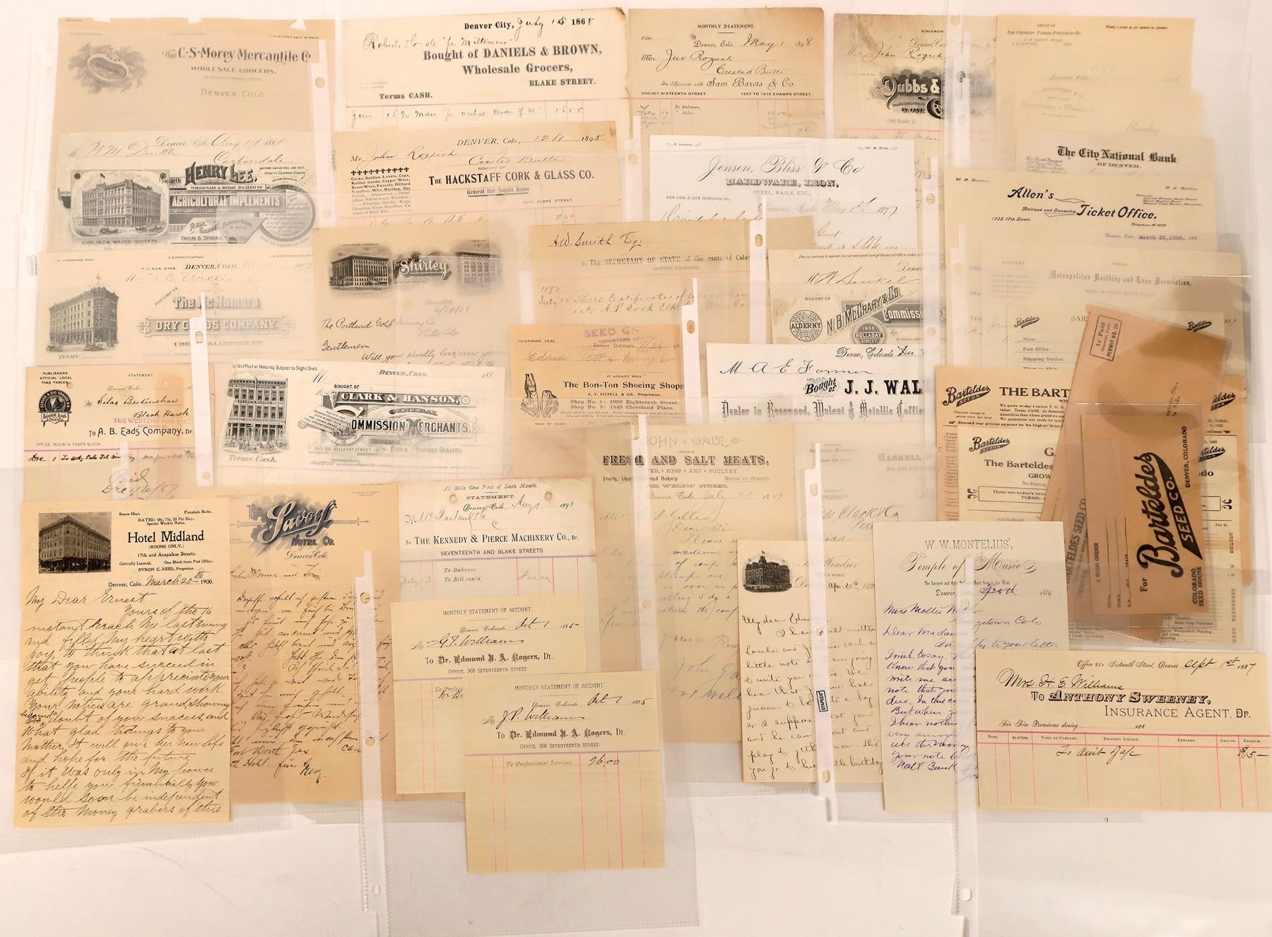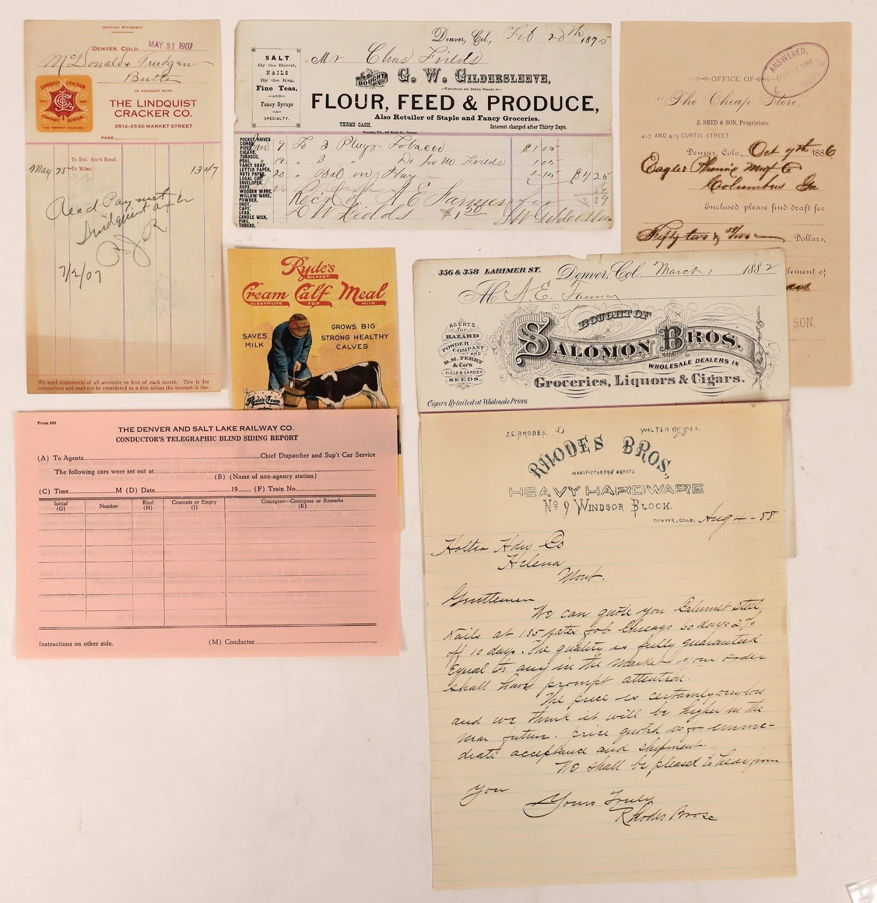 Over 40 pieces. Includes Rhodes heavy Hardware, fancy Salomon Bros., Linquist Cracker, Dr. Rogers, Temple of Music, Rockfinger Commission Agent, Allen's Ticket Office, Denver & Salt Lake Railway, Kennedy & Pierce Machinery, Goldersleeve Produce, Gaul Fresh Meats, Walley Coffins, Hackstaff Cork & Glass, Dubbs & Phipps cigars, Lee Agricultural Implements and my favorite of all the CHEAP STORE, etc.