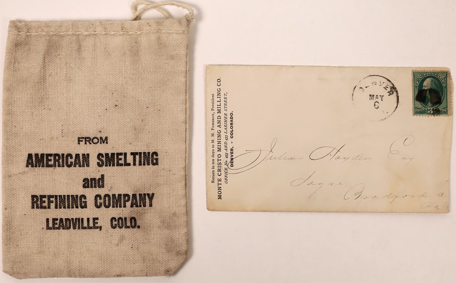 1) Corner advertising for "Monte Cristo Mining and Milling Co., Office No. 433 and 435 Larimer Street." Return in ten days to M. M. Pomerory. president. 2) Small bag from the American Smelting and Refining Company, Leadville, Colo.