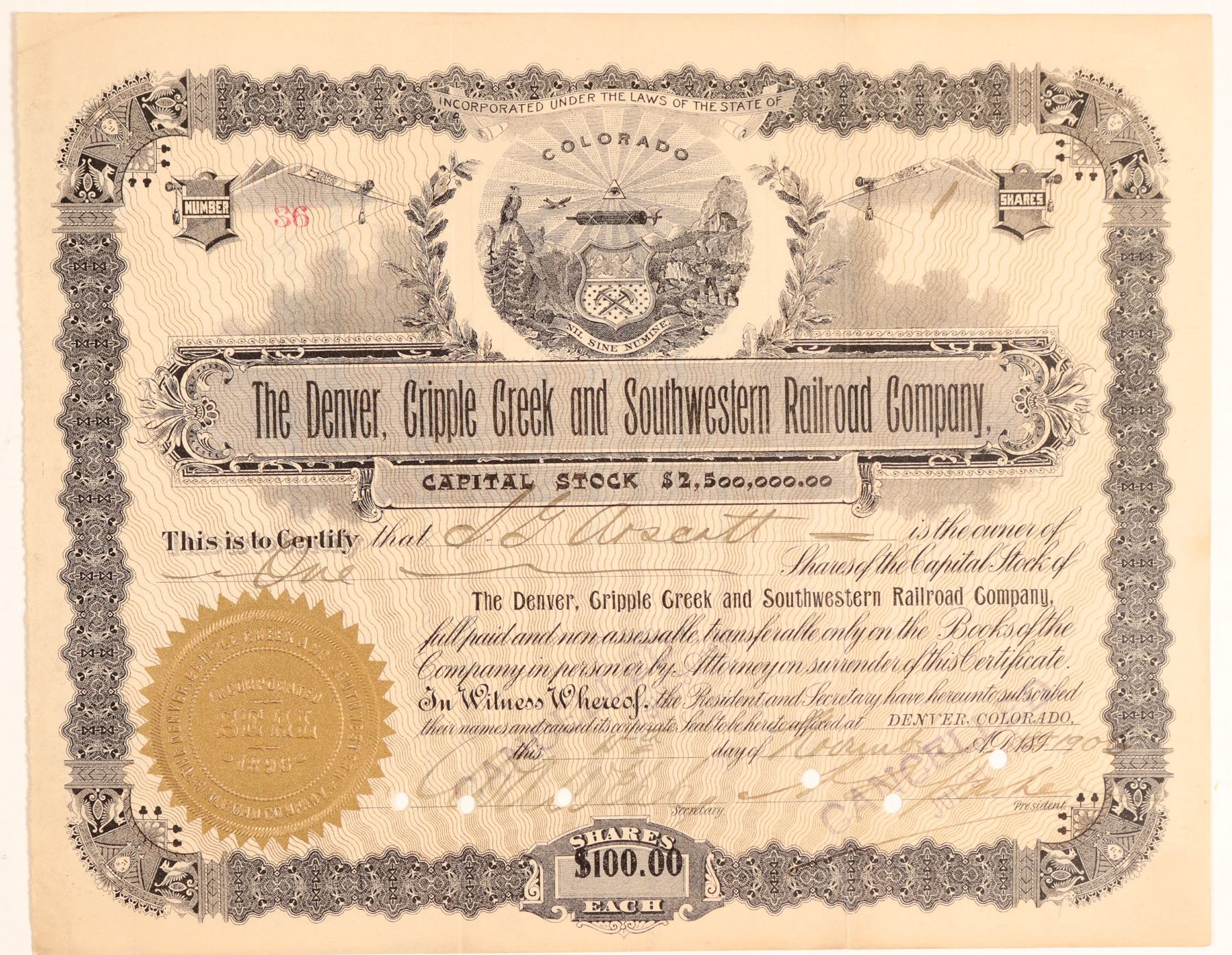 Stock Certificate from the Denver, Cripple Creek and Southwestern Railroad Co. Incorporated in Colorado. Certificate number 36 issued in 1896 at Denver to Arscatt(?). Signatures hole punch cancelled. Size 10" by 8" inches. In nice condition, Canceled. An electric railroad short-line planned from Denver through Cripple Creek, Victor, and Silver Cliff, on through to New Mexico and Arizona. Granted right of way by Congress in 1896 to run through the South Platte and Plum Creek forest reserves. Colorado & Southern Railway bought the railroadís franchise in 1899 for use as the basis of a line built in 1902 from South Platte to Nighthawk.