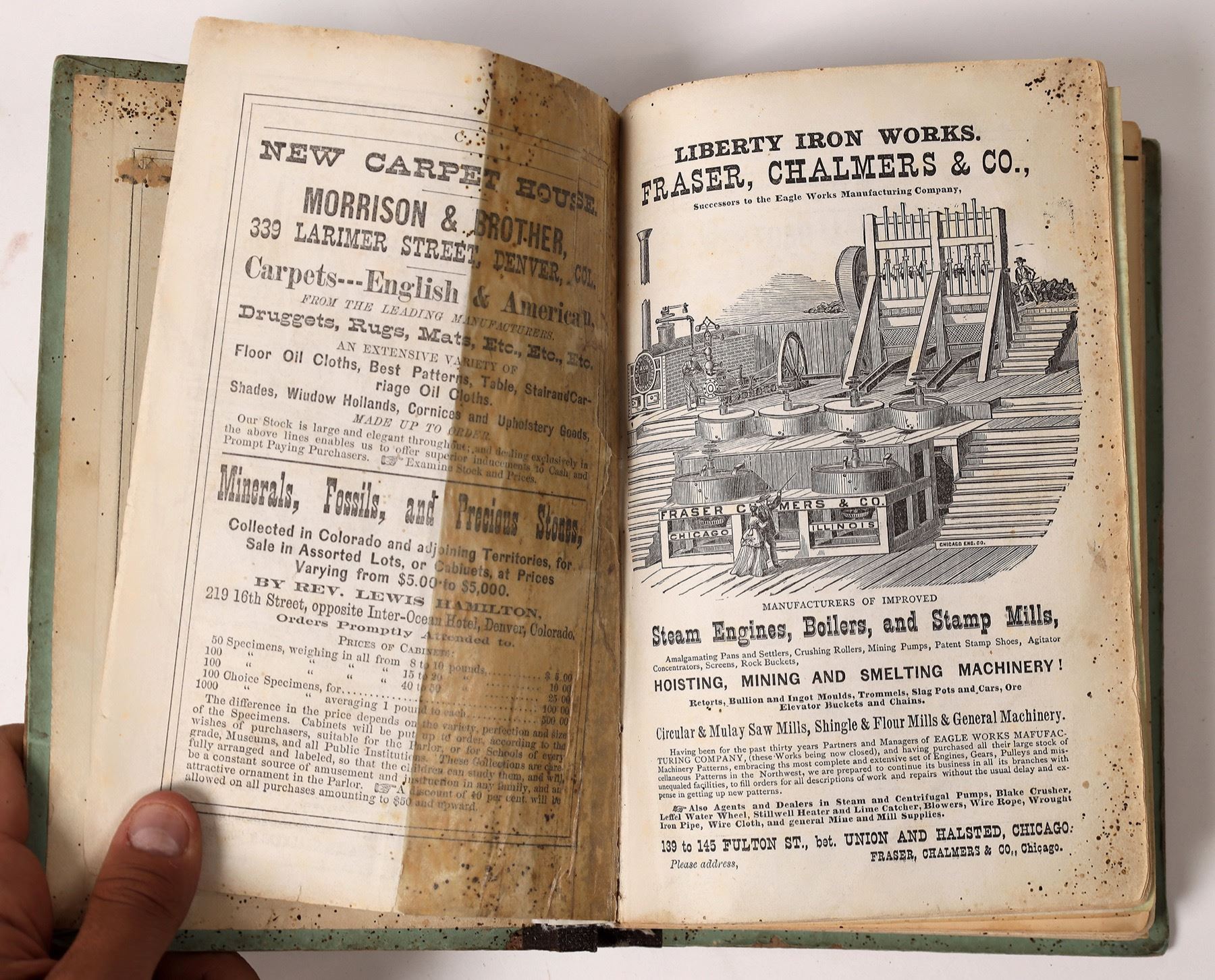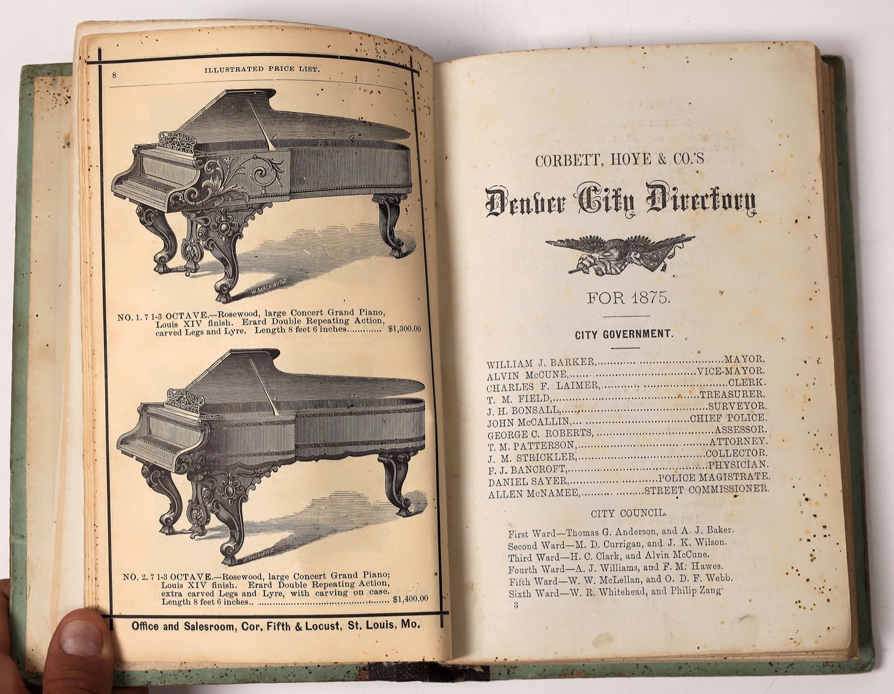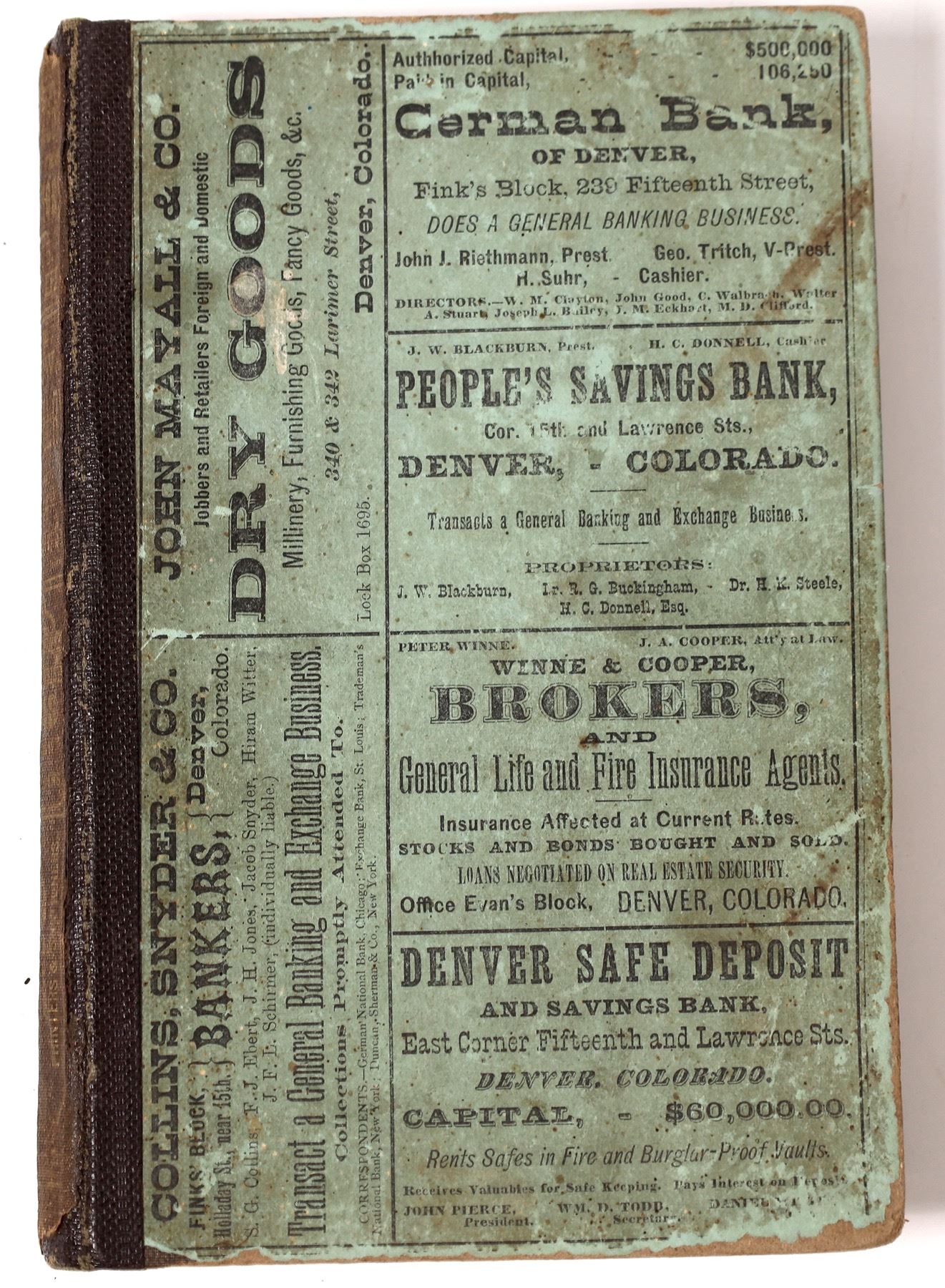 Corbett, Hoye & Co.'s Third Annual City Directory of the Inhabitants, Institutions, Incorporated Companies, Manufacturing Establishments, Business, Business Firms, Etc. in the City of Denver, for 1875. Contains alphabetical and classified indexes. Business advertisements throughout. 5.5 x 8.75, good condition, the front page is taped.