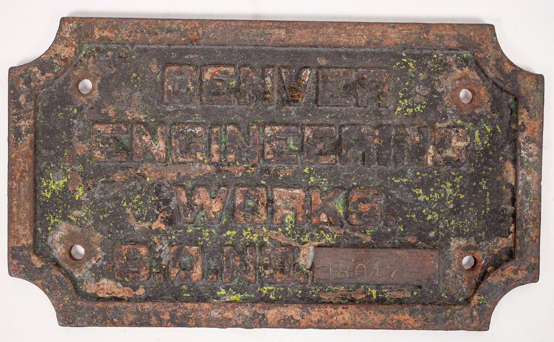 Embossed Denver Engineering Works cast iron Hoist equipment plate from Gold Hill. Our consignor's father was a hoist operator before and during the Depression in Gold Hill. About 8 x 12", CIRCA 1900-1905.