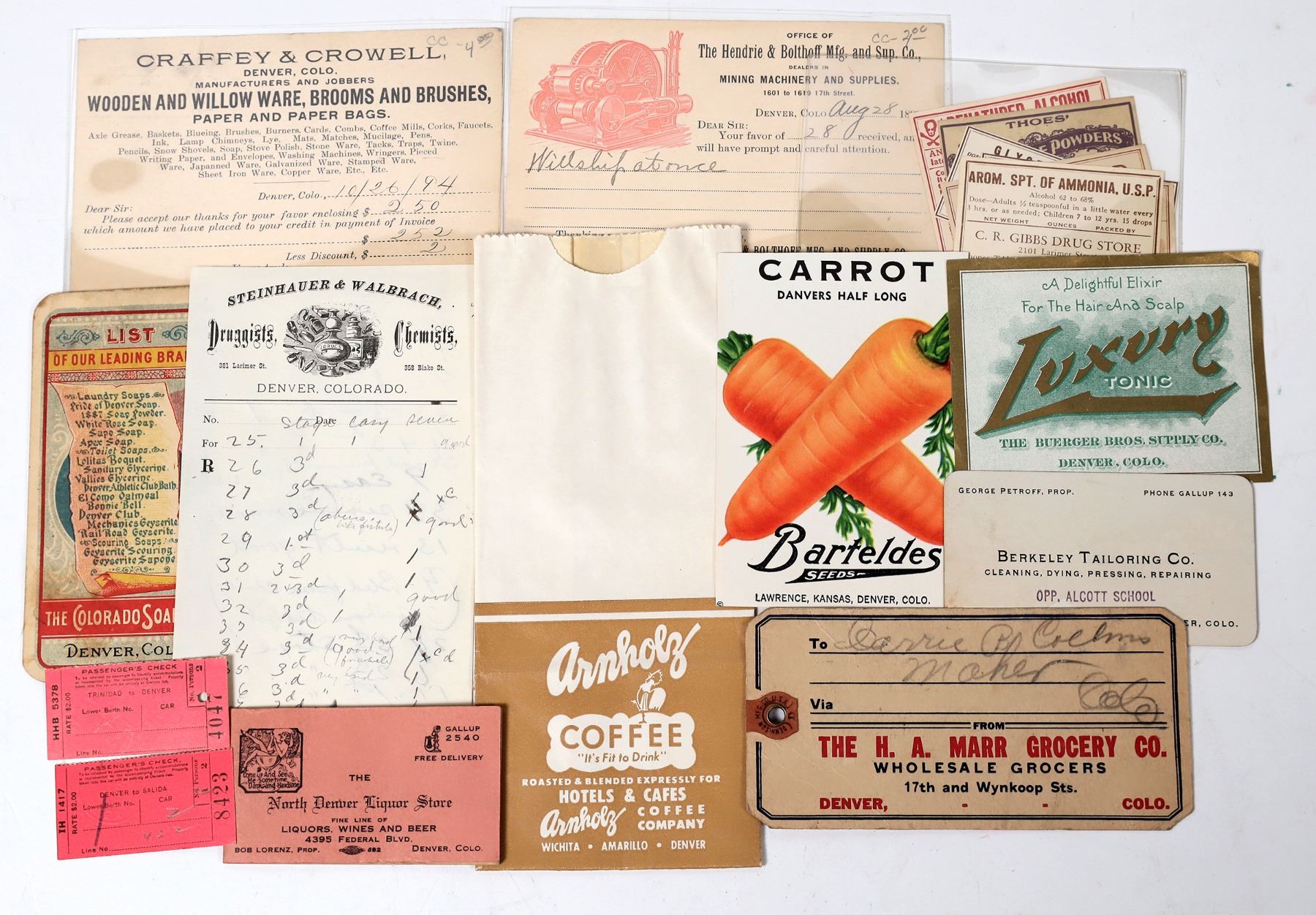 Lot of about 20 pieces of ephemera from Denver, Colorado. This lot includes drug store labels, an advertising pocket notebook, a druggist billhead, a carrot seed label, business cards, railroad ticket stubs, a coffee bag, etc. Various sizes, largest is about 3.5 x 8 inches. Good condition.