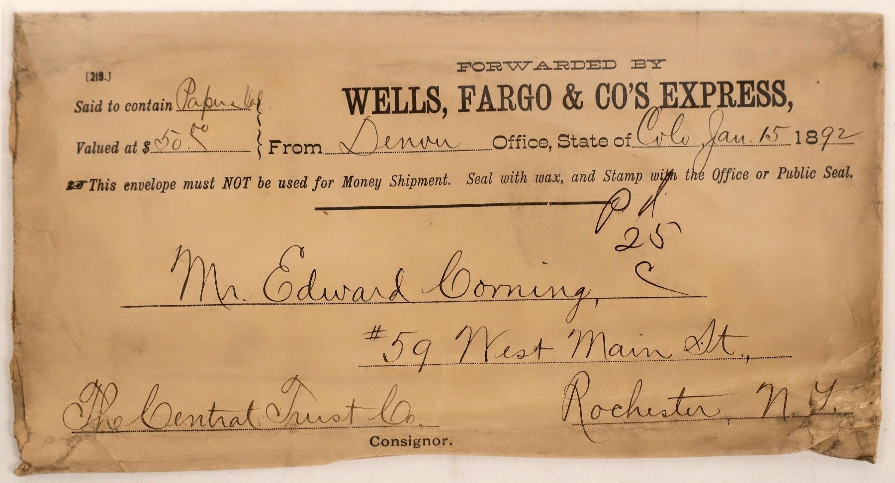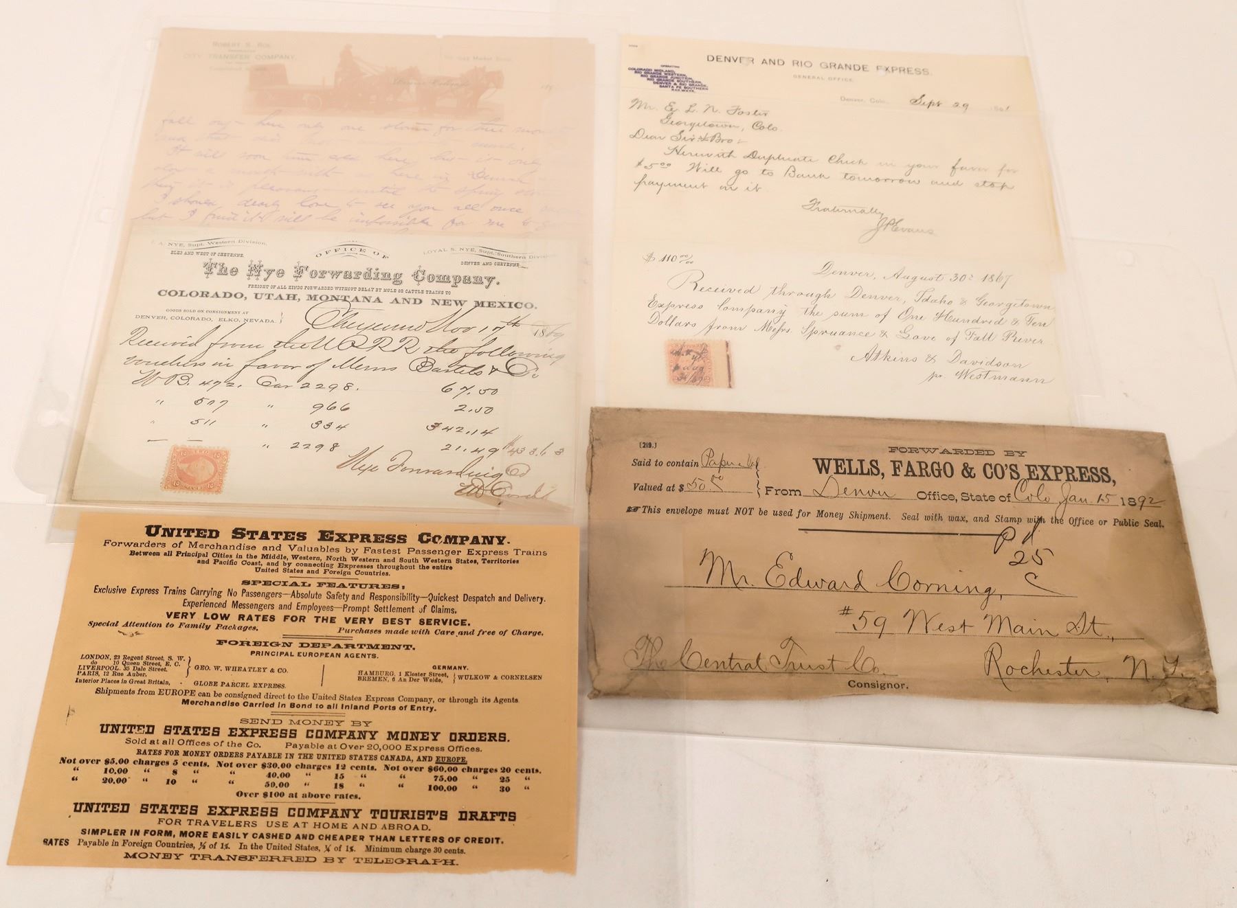 Lot of 7. 1-2) Robert S. Roe, City Transfer Company letterheads with great horse and wagon underprint vignette. Dated 1894, Established 1868. Two pages, one letter about family and what he is doing. [I am going down to the Platte River this evening with some friends after ducks and geese.] 3) Fancy letterhead for the Nye Forwarding Company of Colorado, Utah, Montana and New Mexico. List of items received from the UPRR.1869. 4) Denver and Rio Grande Express letterhead, 1891. 5)Note stating he had received from the Denver, Idaho and Express Company $110. 1867. 6) 1892 Wells Fargo & Express Company envelope. 7) 1899 United States Express Company received.