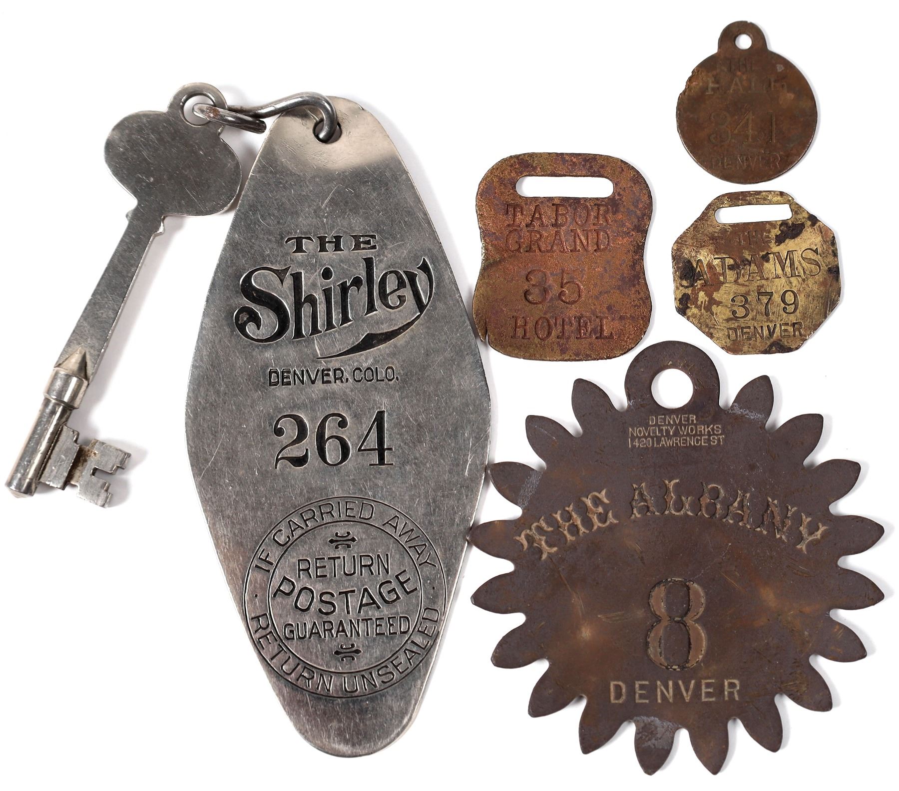 5 different Denver hotel key tags. White metal oval, The Shirley. Round The Hall. The Albany. Tabor Grand. The Adams. c. 1890-1910.