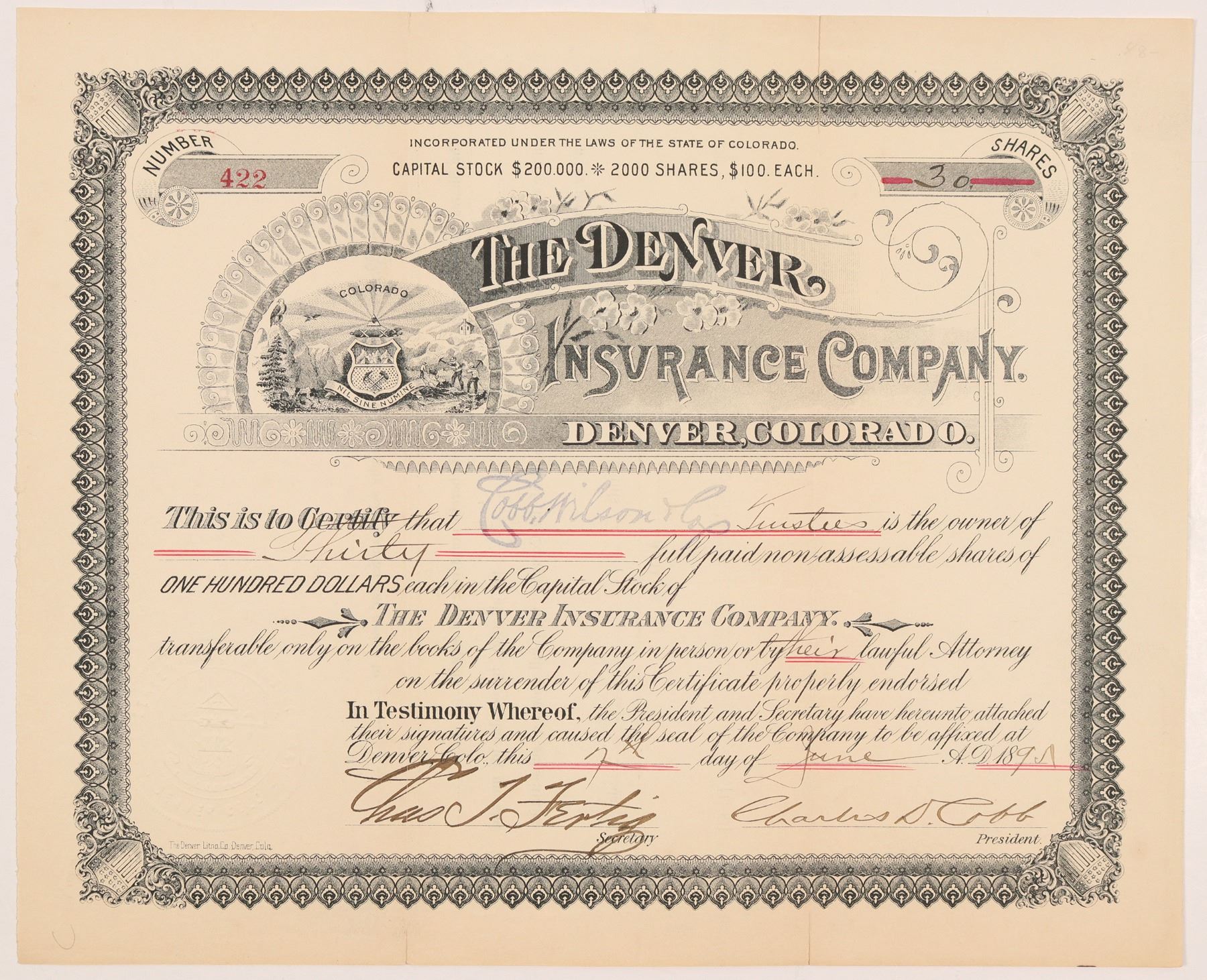 Inc. in Colorado. No. 422, issued for 30 shares to Cobb, Wilson & Co. on June 7th, 1895 in Denver. Signed by president Charles D. Cobb and secretary Chas. Ferig. Not cancelled. Black border and print. Fancy logo with Colorado state seal themed vignette. Printed by the Denver Lith. Co. Folds, light wear. 8.75 x 10.75" Ken Prag Collection