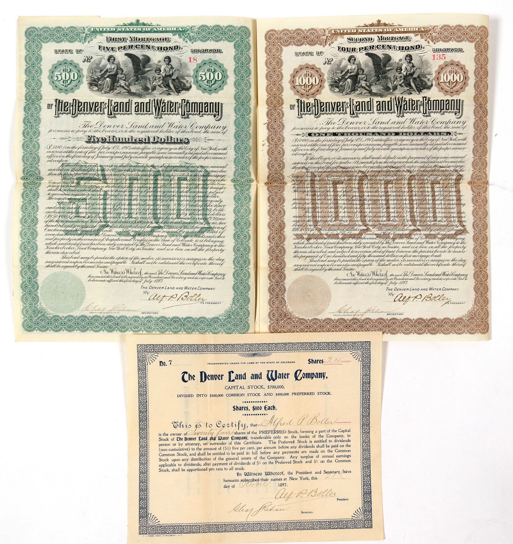 Lot of 3 different, all uncancelled. 1) Stock certificate No. 7, issued to the company president Alfred P. Boller in 1897. 2) Two different bonds, $500 and $1,000, both issued in 1897. Allegorical vignettes. Many coupons attached. Bond states the company has property in Arapahoe and Douglas Counties. According to Irrigation Age, Vol. 12, the company owned 17,000 acres of land. They also built the Castlewood Dam in 1890. The dam failed and caused a huge flood in 1933. () Ken Prag Collection