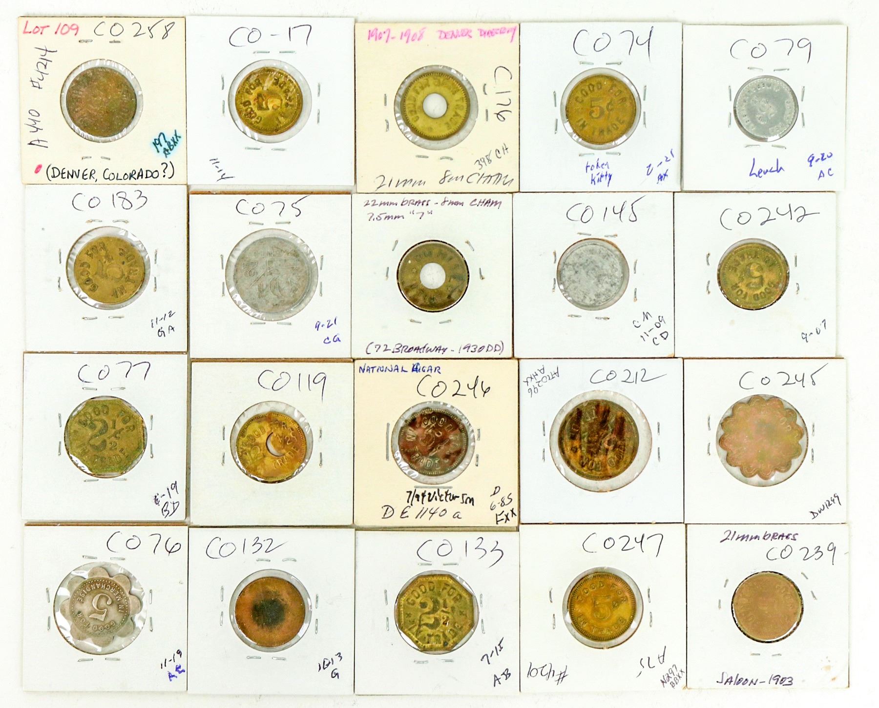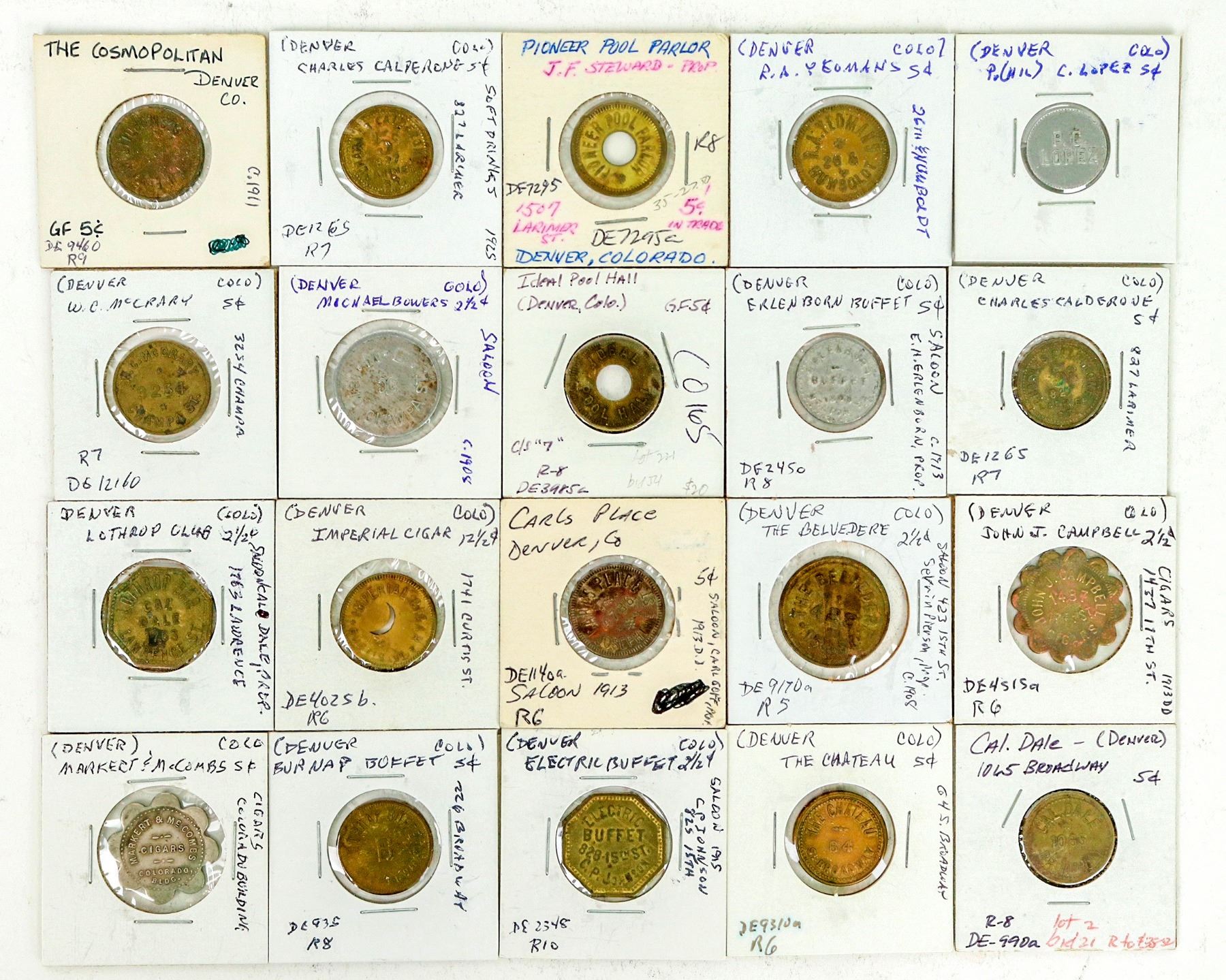 Twenty Denver tokens that don't say Denver: Pioneer Pool Parlor; Charles Calperone; W. C. McCrary; R. A. Yeomans; The Chateau; Imperial Cigar; P. C. Lopez; Lathrup Club and many more.