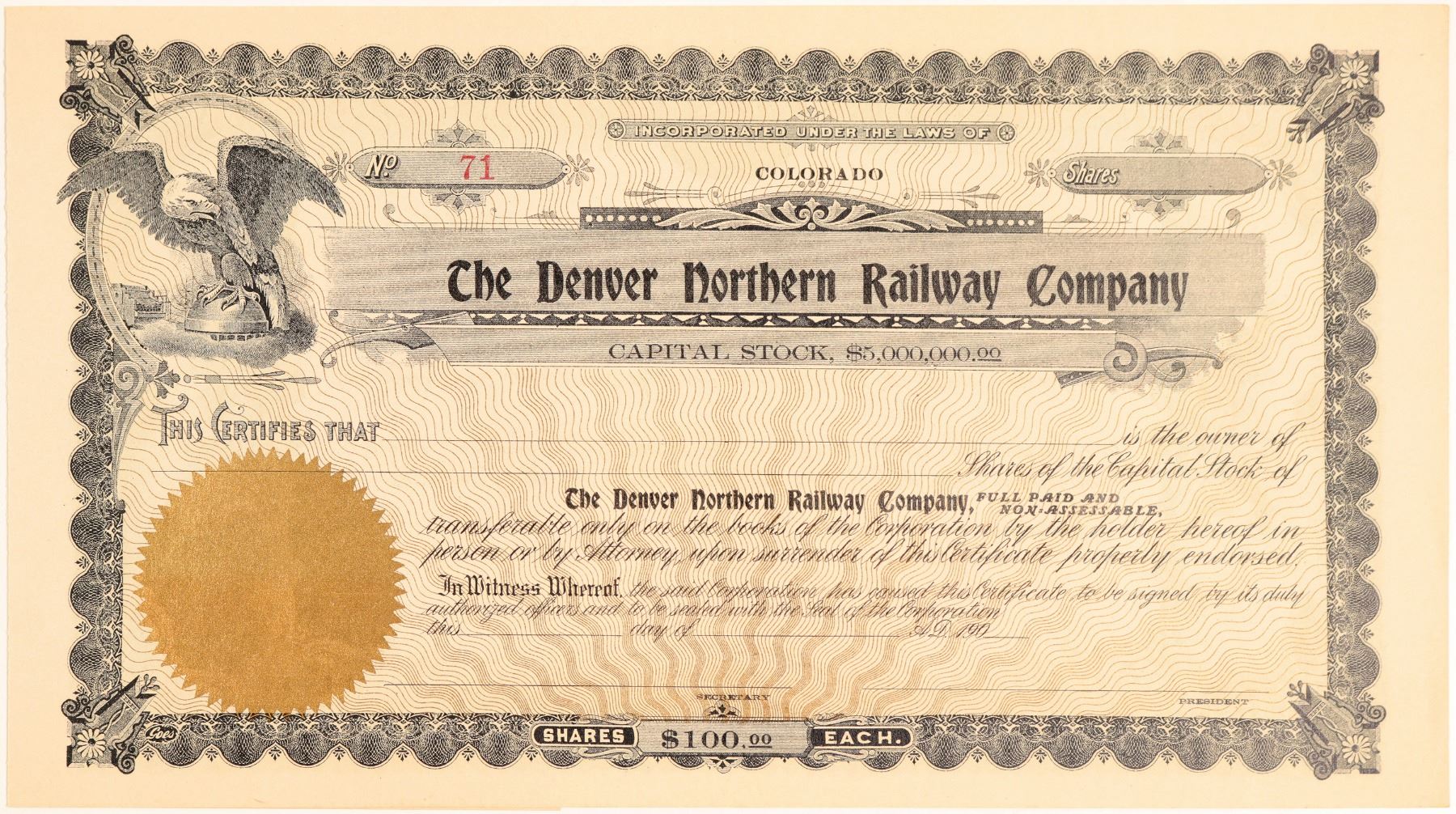 Stock Certificate from the Denver Northern Railway Co. Incorporated in Colorado. Certificate number 71 issued in c1906. Size 10 by 5.5 inches. In extremely nice condition. Unissued. Eagle vignette. Rare! According to Electrical Review, Volume 48, 1906, this company was incorporated to construct an electric railway from Denver through Northern Colorado to the state line. $3,000,000 capitalization. WC Brown of Chicago is the main backer. Robert Law of Denver is the president and Charles P. Brown is the secretary/treasurer.