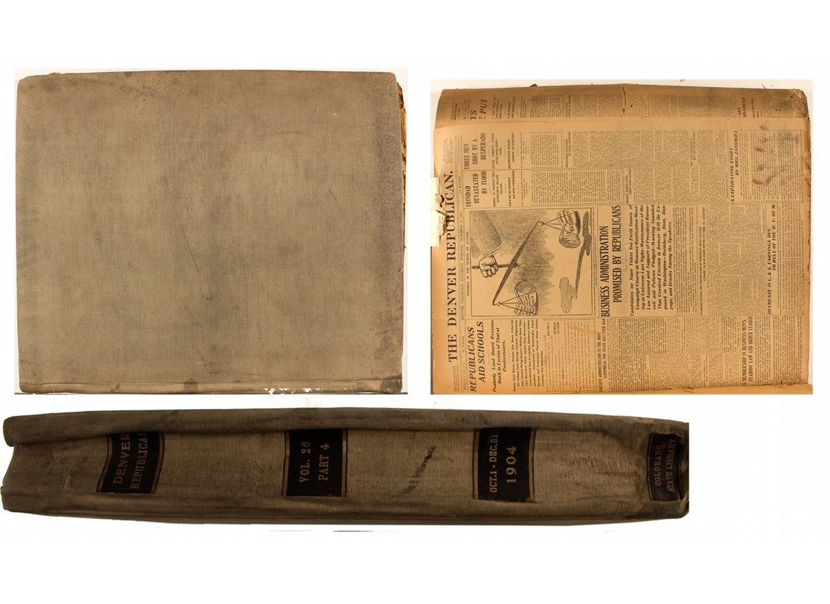 Vol. 26, Part 4. Oct. 1 - Dec 31, 1904. Colorado State Library. The Denver Republican was published from 1887-1913 by the Republican Publishing. Co. Published daily, No. 1 was published on Jan. 1, 1887 until No. 299, Vol 35, Oct. 26, 1913. Measures 19 1/2 x 23", with spine separating from text block with discoloration and water damage on cover. Several tears located near center of page.