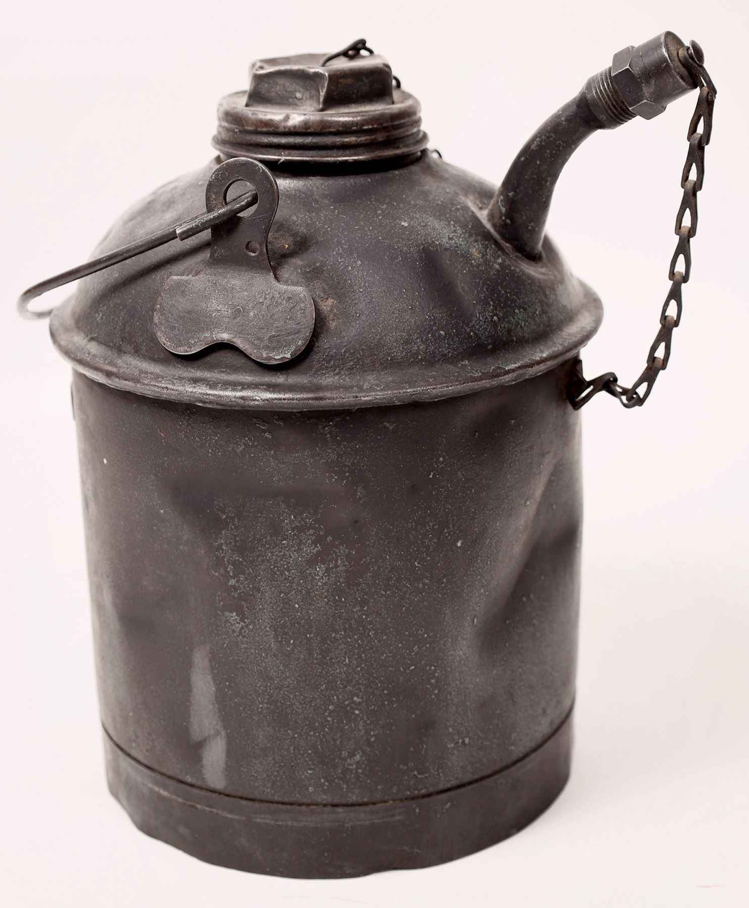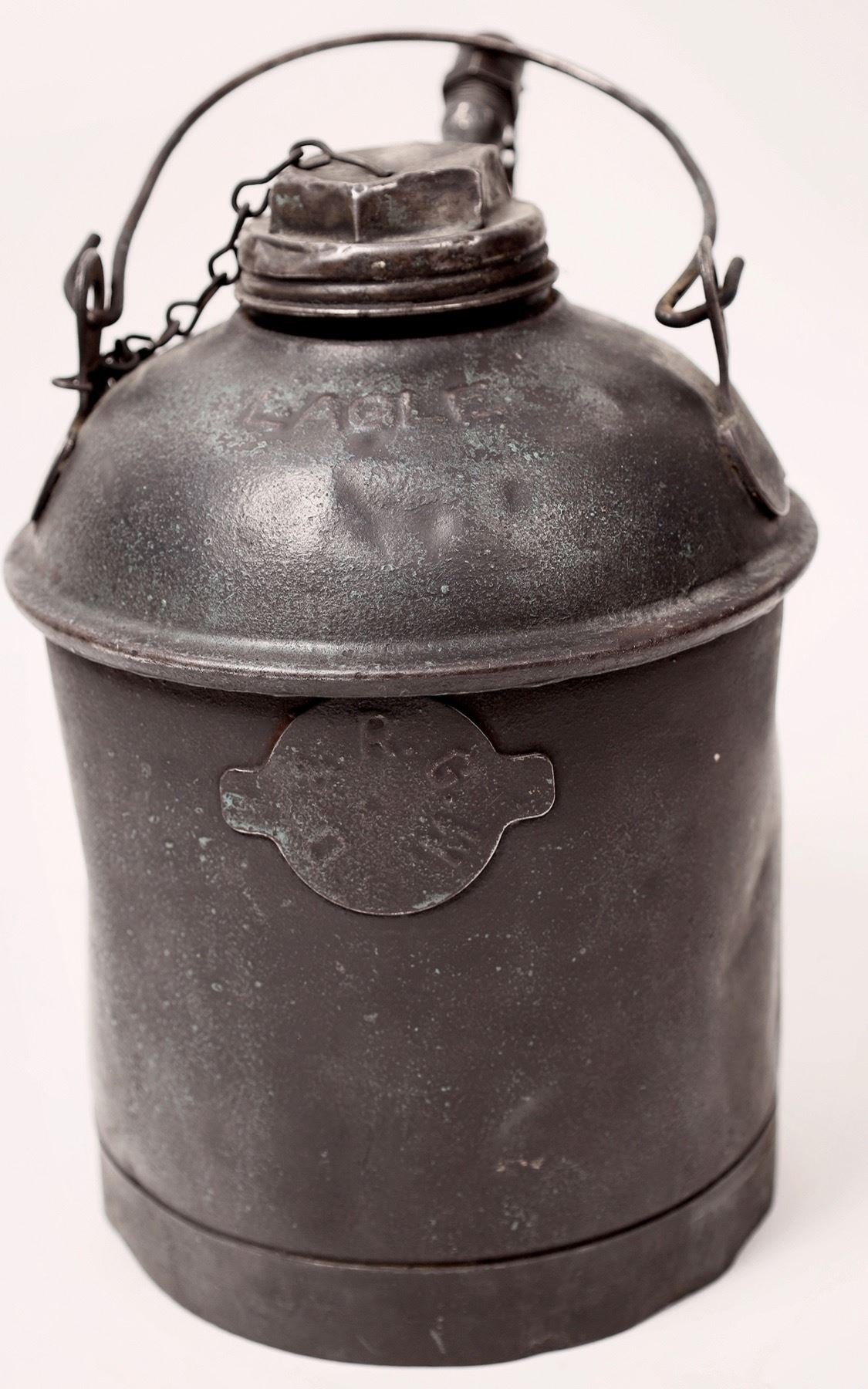 Black oil can with D and R G W embossed metal label. Eagle maker. 9.5" tall. About 7 dents.