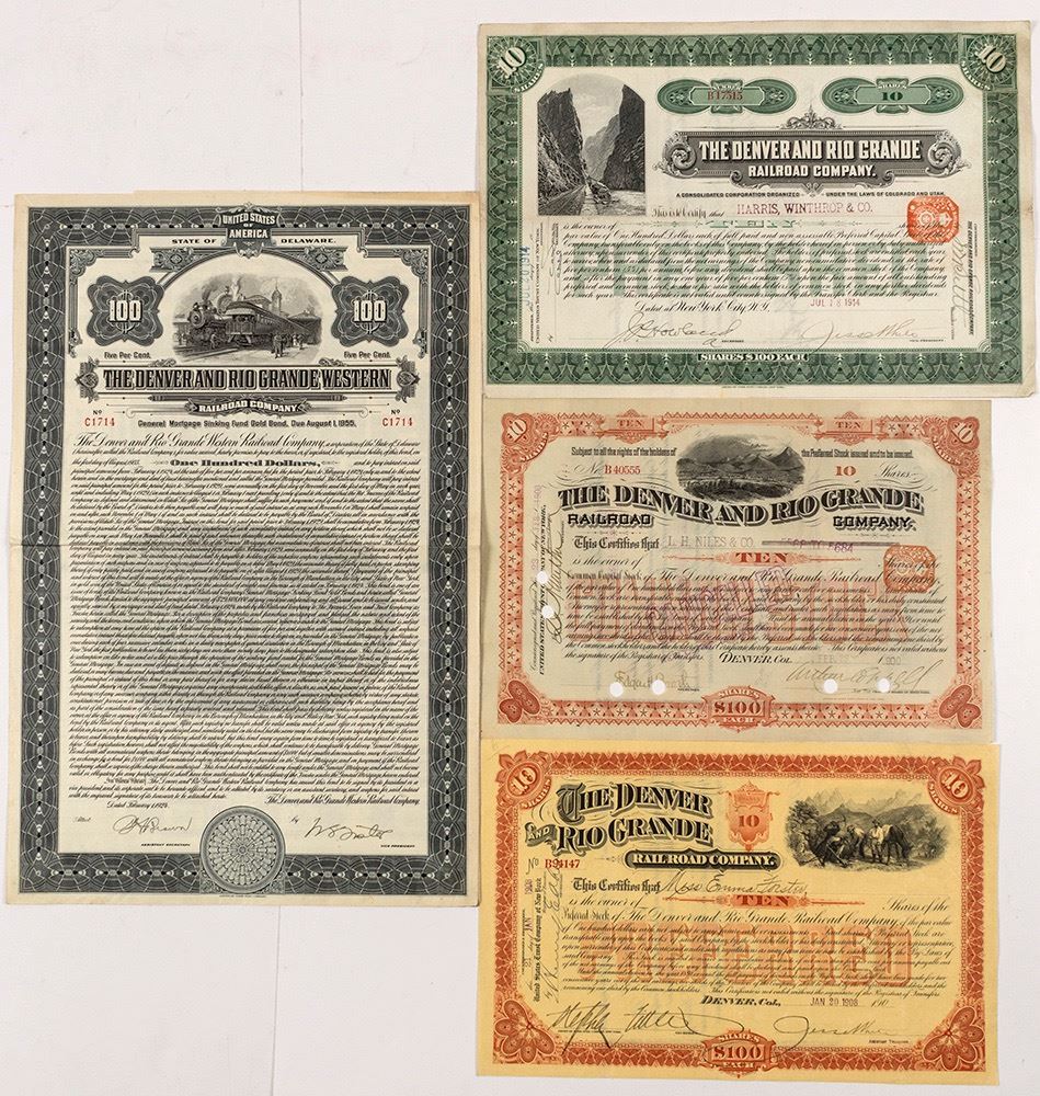 Lot of four. 1) 1900 stock for 10 shares to LH Niles & Company. Signed by secretary Edgar Booth and Arthur (?) for the Board of Trustees. Vignette of train running along the base of a mountain chain. Hole punched cancelled. LH Niles was a prominent, "arbitrage house" from New York in the late 19th Century. These companies make a business of buying and selling between the two markets (England and America). 2) 1908 stock certificate to Miss Emma Forster for ten shares. Vignette of prospectors looking for gold. Some pinholes and dog ears. Overall a nice specimen. 3) 1914 green stock certificate issued to Harris, Winthrop & Company for 10 shares. Signed by secretary Howland and vice president Jesse White. English 2 shilling revenue stamp. Vignette of railroad in river canyon. 4) Sinking Fund Gold Bond for the Denver & Rio Grande Western RR. 1924. Number C1714. Coupons 25 through 63 still attached. Overall a very nice piece with few issues. Date: 1900 - 1924 Location: Colorado HWAC# 56919
