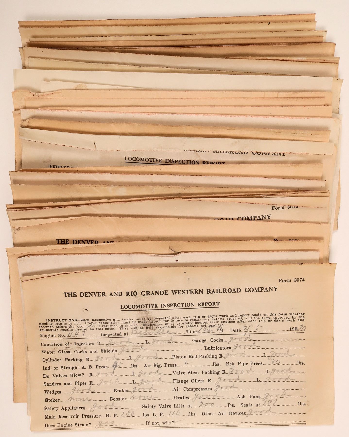 Lot of 34 Locomotive Inspection Reports issued at Leadville, Colorado in 1930. Reports for Locomotive #663, 644, 680, all built by Baldwin Locomotive Works; and Locomotives #1152, and 1147, built by the American Locomotive Co. Each measures 4.5 x 8.5" Varying condition; please inspect.