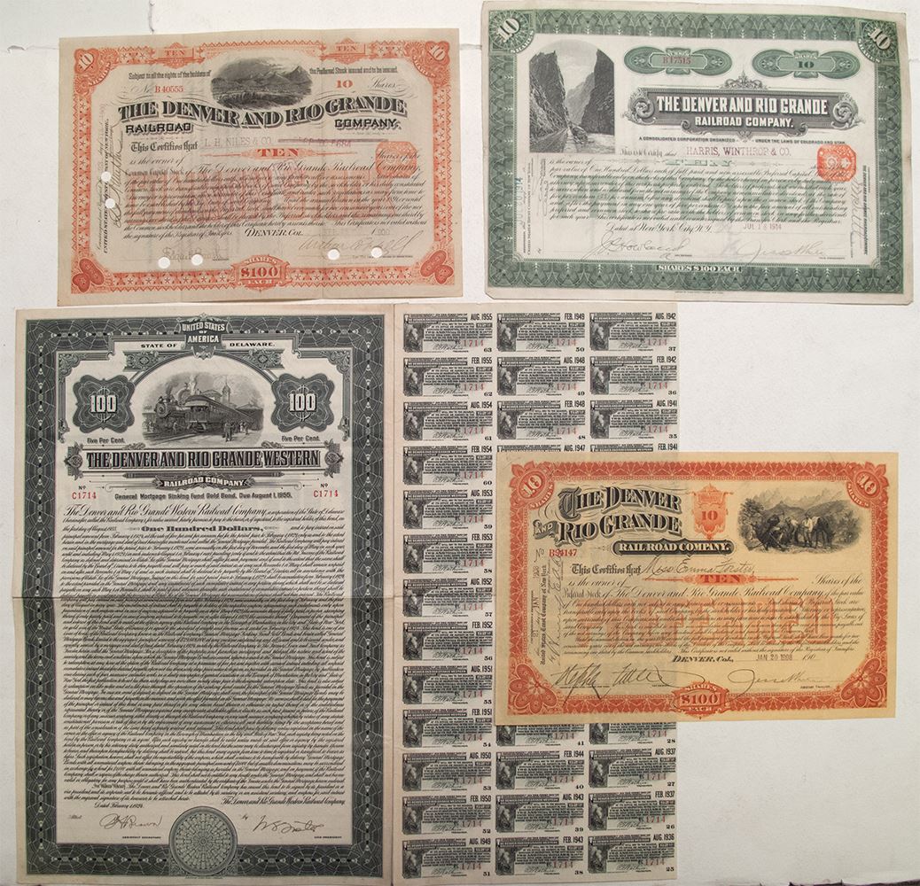 1) The Denver and Rio Grande Railroad Company. Stock #B40555 for 10 shares to L. H. Niles in 1900. Cancelled. 2) The Denver and Rio Grande Railroad Company. Stock #B94147 for 10 shares to Miss Emma Foster in 1908. 3) The Denver and Rio Grande Railroad Company. Stock #B17515 for 10 shares to Harris, Winthrop & Co. in 1914. TWO SHILLING TAX STAMP. 4) The Denver and Rio Grande Western sinking fund gold bond. Issued 1924. # C1714. Stamps 25 to 63. All four are different! Vignettes include miners, station scene, train running in canyon next to river and mountain scene.