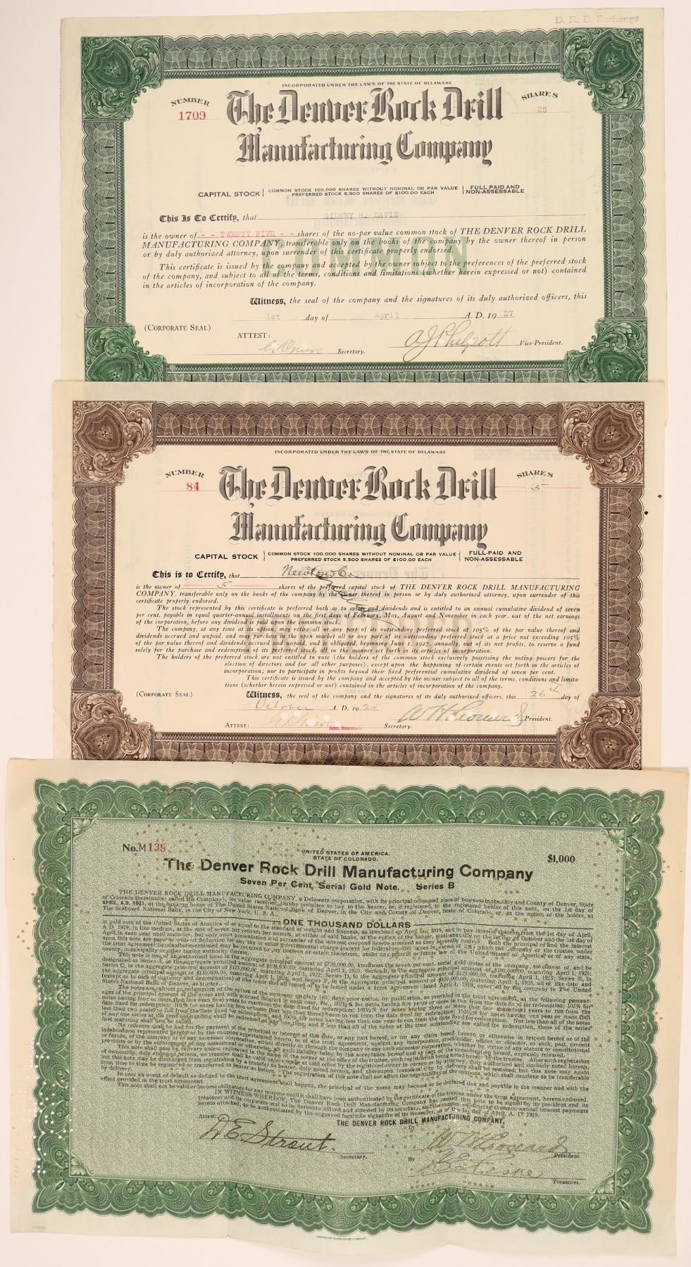 All three are Denver Rock Drill Manufacturing Company. All are different. 1) Bond. Denver, Number 139. Cancelled. 2) Brown Stock. Number 84 issued to Newton & Company. Cancelled. 3) Green stock. Number 1709. Cancelled. "Growth of the Denver Rock Drill Manufacturing Company on this site began in 1910, driven by global demand for a line of pneumatic rock drills known as “Waugh” drills, named for their inventor, and company founder, Daniel S. Waugh. Tried and tested in the Rocky Mountains, these drills found use around the world, from Johannesburg to Melbourne to Lima._x000D_