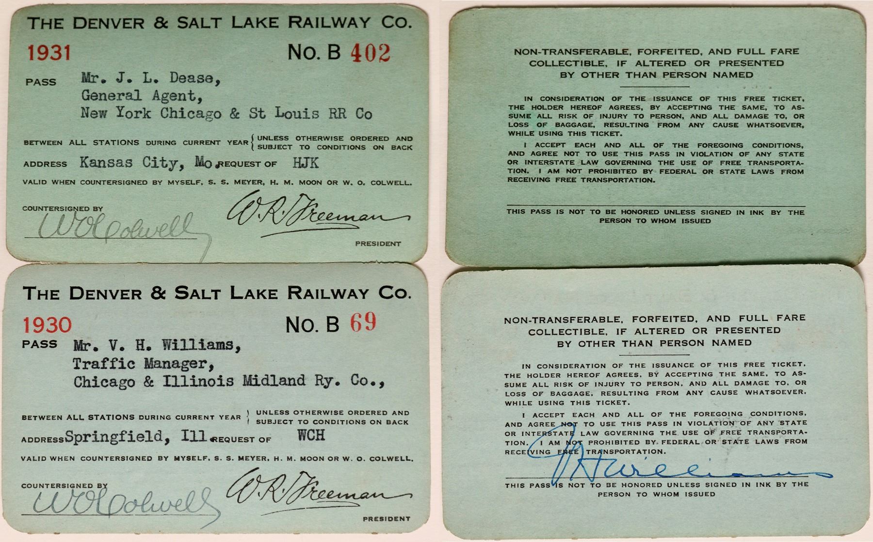 Lot of 2. 1) No. B69, issued for 1930 to VH Williams, Traffic Manager for Chicago & Illinois Midland Ry. Co. 2) No. B402, issued for 1931 to JL Dease, Gen. Agent for New York Chicago & St. Louis RR. Both are black print on blue paper. Printed signature of president WR Freeman and signed by W Holwell. This railroad began in 1902 as the Denver, Northwestern and Pacific Railroad formed by David Moffat and others to connect Denver and Salt Lake City. At a cost of $75,000 a mile, it cost Moffat his fortune, and he died while trying to raise more money for it. It reorganized as the Denver & Salt Lake Railway after Moffat's death and continued westward. However, it only ever reached Craig, Colorado, less than half the distance to Salt Lake City.