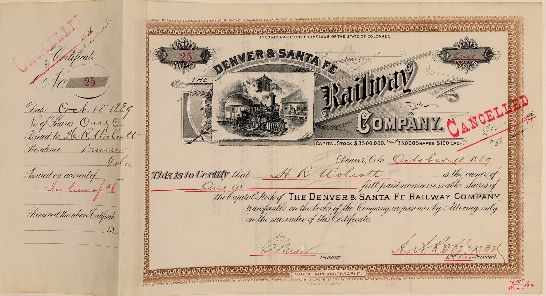 Stock Certificate from the Denver & Santa Fe Railway Co. Stock. Incorporated in 1887 in State of Colorado. Certificate number 25 issued on October 8, 1889 to H. R. Woolcott. Signed by A. A. Robinson (2nd Vice President), and E. Mulder (?). Printed by The Denver Litho Co. Denver, Colo. Size 12 by 8 inches. In nice condition. Canceled. Nice vignette of train at the station, ornate border in light brown, cancelled with date stamp 8/12/96, handwritten note "#53 issued" and punch holes over signatures. Witness signature on reverse is Betts. Very good condition. Issued to Henry R. Wolcott, well known capitalist, prominent businessman, industrialist, and highly influential banking and mining interest in Colorado, New York and throughout the West. Wolcott managed the Boston and Colorado Smelting Works at Blackhawk, was given charge of the Alma plant and Argo plant, and became the treasurer of the Colorado Smelting and Mining Company. He was elected Director of the Equitable Life Assurance Society and instrumental in the construction of the Boston building and the Equitable building in Denver. Wolcott was Vice President of the First National Bank of Denver for over a decade, Vice President of the Colorado Fuel & Iron Company for several years and also President of the Colorado Telephone Company. He helped secure Fort Logan as a military post for Denver and was an organizer and charter member of the Denver Club, acting as President for many years. Wolcott was educated in Providence, Rhode Island and Cleveland, Ohio and earned a Masters of Arts Degree from both Yale University and Colorado College. Because of his generous contributions to public eduction the Wolcott Medal for Excellence in public reading was established for the young ladies of the East Denver High School. Gilpin county elected Wolcott Senator in 1878 at the same time his brother, Edward Oliver Wolcott, was representing Clear Creek county in the General Assembly. Henry R. Wolcott was elected President Pro Tern and during his term served as acting governor of Colorado. Wolcott was a member of the Union League, University Clubs of NY, the Racquet and Tennis, Brook, Lambs, New York Yacht and Larchmont Yacht Clubs of New York; the Atlantic Yacht, the Manhasset, the Tavern Clubs of Boston; the Metropolitan Club of Washington; and the Denver and University Clubs of Denver. ("History of Colorado", edited by Wilbur Fisk Stone, published by The S. J. Clarke Publishing Co. 1918 Vol. II)