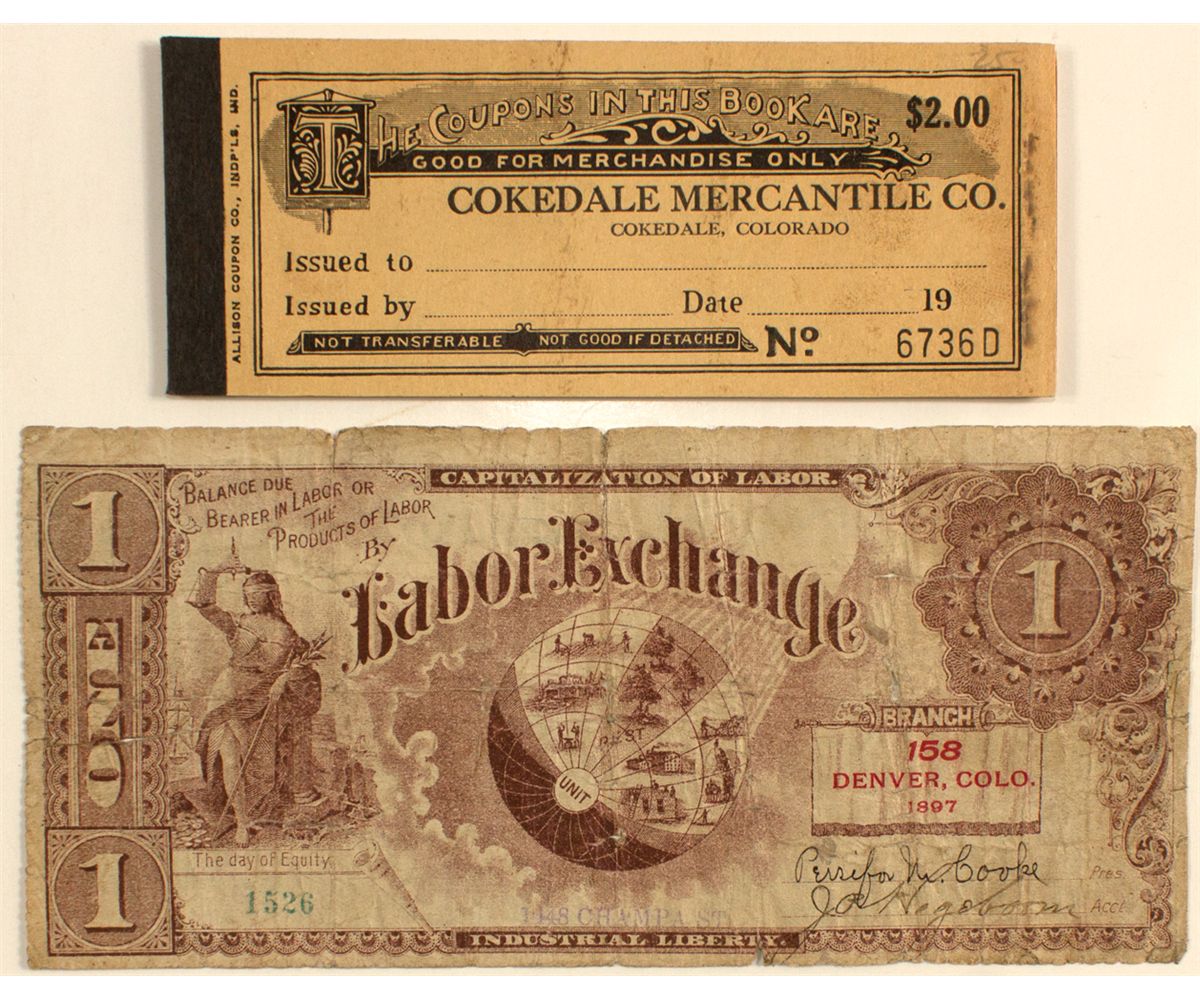 Two pieces from the mile high city: 1) 1897 $1 Capitalization of labor note from the Labor Exchnage; 2) Book of coupons from the Cokedale, Colorado Merchantile store. Prag collection.