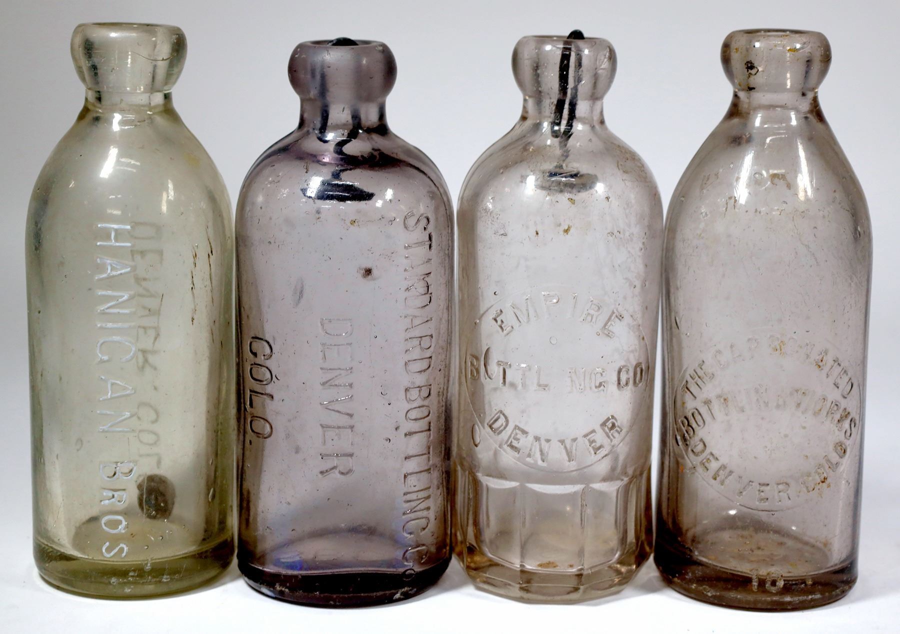 4 Different clear Denver soda bottles. Embossed Hanican Bros//Denver, Colo. Several bruises. Empire/Bottling Co./Denver. Standard Bottling Co./Denver/Colo, a few dings. The Carbonated/Bottling Works/Denver, Colo. Base bruises. No apparent chips or cracks.