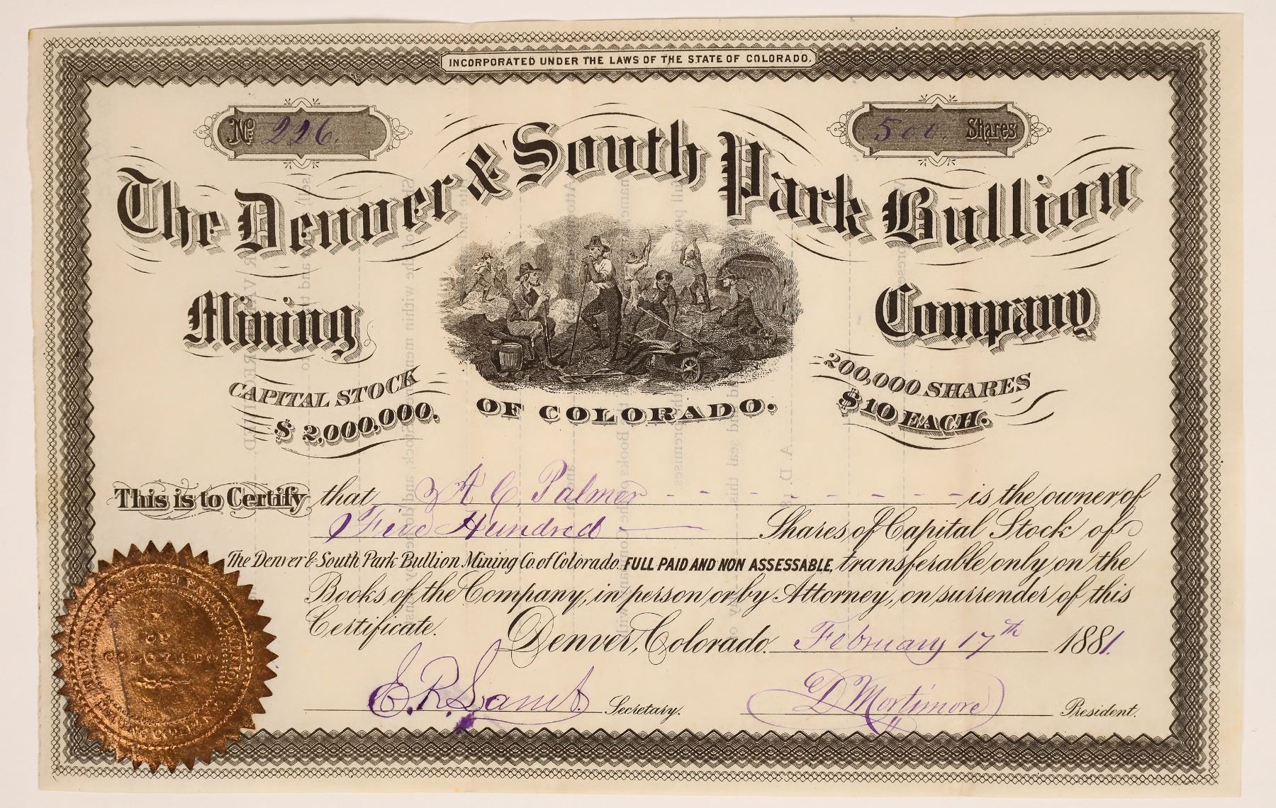 Rare. Inc. in Colorado. No. 226, issued for 500 shares to A.C. Palmer on February 17th, 1881 in Denver. Signed by president D. Mortimore and secretary E.R. Lamb. Not cancelled. Black border and print, gold seal, and underground mining vignette. No printer listed. 6.5 x 10" Deep folds. Not listed in C&L. One newspaper reference was found on CHNC: the Fairplay Flume (Dec. 2, 1880) says the company has incorporated to do business in Park County. No other information found. Was this associated with the Denver & South Park Railroad?
