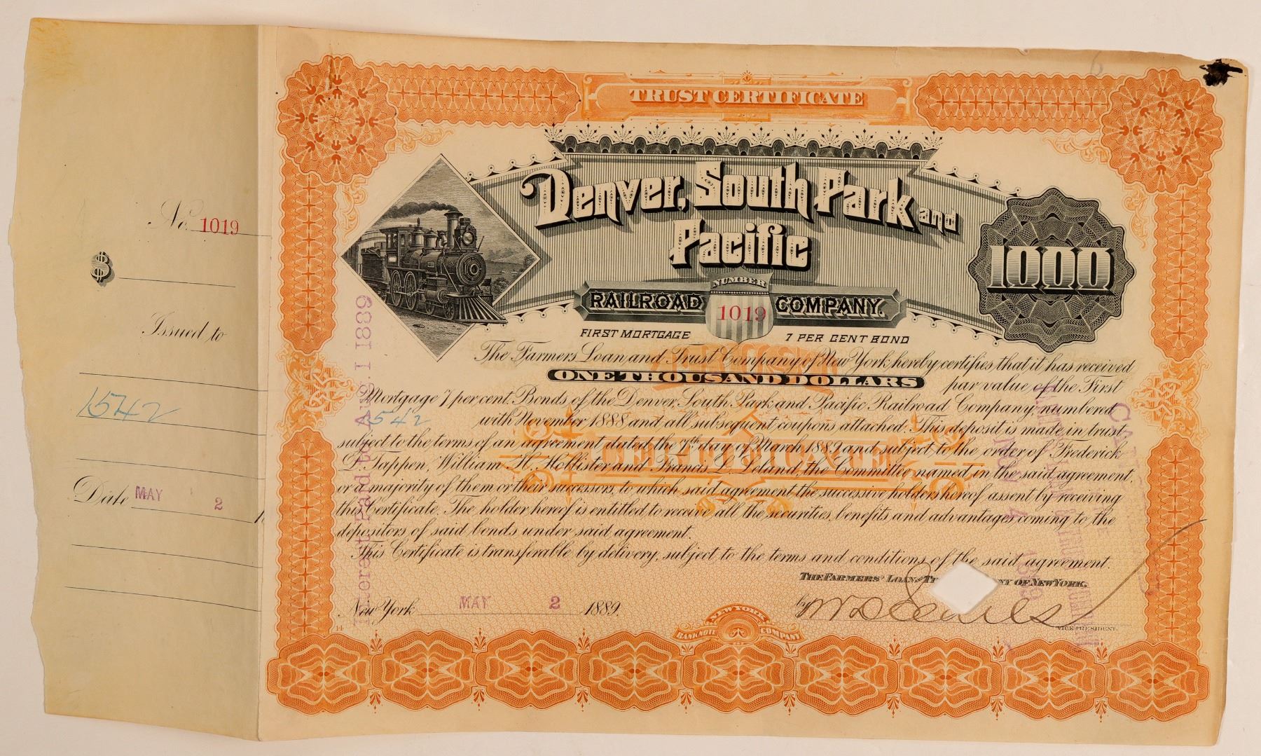First Mortgage Bond from the Denver, South Park & Pacific Railroad Co. Certificate number 1019 issued on May 2, 1889 at New York. Signed by M. D. Searls, Vice President. Printed by New York Bank Note Company. See online photo for condition issues. Vignette of train & certificate of deposit, 1st mtg bonds 1000. Ornate orange border and under print. Stamped "Interest paid to Aug 1, 1889" Cancellation stamp from Farmer's Loan and Trust Company, Nov 4, 1889. Reads "...part value of the First Mortgage 7 percent. Bons of the Denver South Parkland and Pacific Railroad Company numbered 542 ..." Punched with large diamond over signature. Top edge is worn and discolored. Top right has black ink stain. Attached receipt. Operated 1872 to 1889, when it was sold to the Denver, Leadville and Gunnison Railway. The line ultimately extended from Denver to the Baldwin/Caselton areas near Gunnison. From Denver, it went up the valley of the South Platte River to South Platte, then to Buffalo Creek & Bailey to Como through South Park to Garo, Fairplay and Alma. As such, it service many of Colorado's central mining districts during their boom years. They originally entered a deal in 1880 with Jay Gould and the Denver & Rio Grande regarding a line to Leadville from Buena Vista. Gould decided that the D& RG would build the line and the DSP& P could share the rights, as long as the DSP& P would build the line into Gunnison County via Chalk Creek and share rights. The agreement was ended in 1884, and DSP& P built their own line into Leadville, crossing the Continental Divide twice.