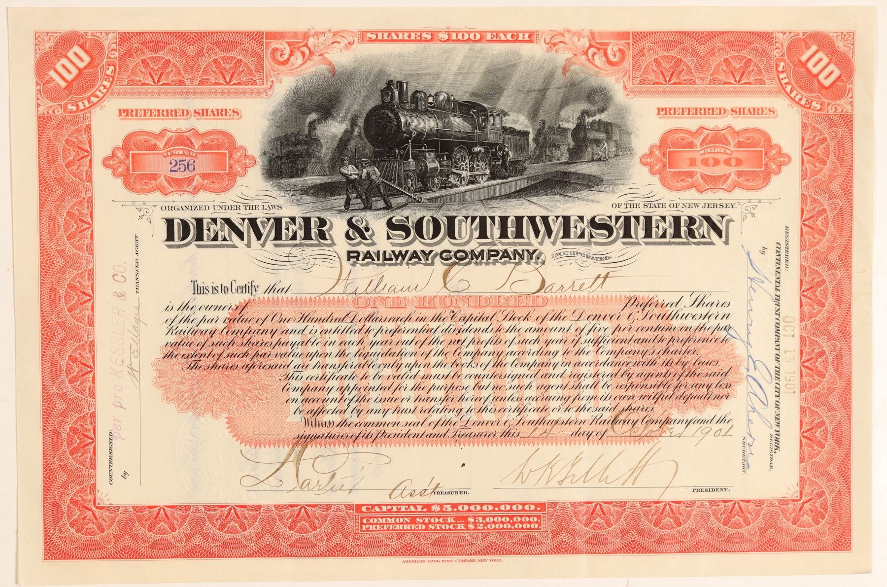 Stock Certificate from the Denver & Southwestern Railway Co. Incorporated in New Jersey. Certificate number 256 issued in 1901 to William G. Darrett. Signed by president W. K. Gilbutt(?) and (?). Printed by American Bank Note. Size 11 by 7.5 inches. In nice condition. Not cancelled. Vignette of train. Preferred Orange. Operated 1899-1904. This was a holding company that was the consolidation of the Golden Circle, Midland Terminal, and Cripple Creek & Colorado Springs Railroad Co. Succeeded by Cripple Creek Central Railway Company.
