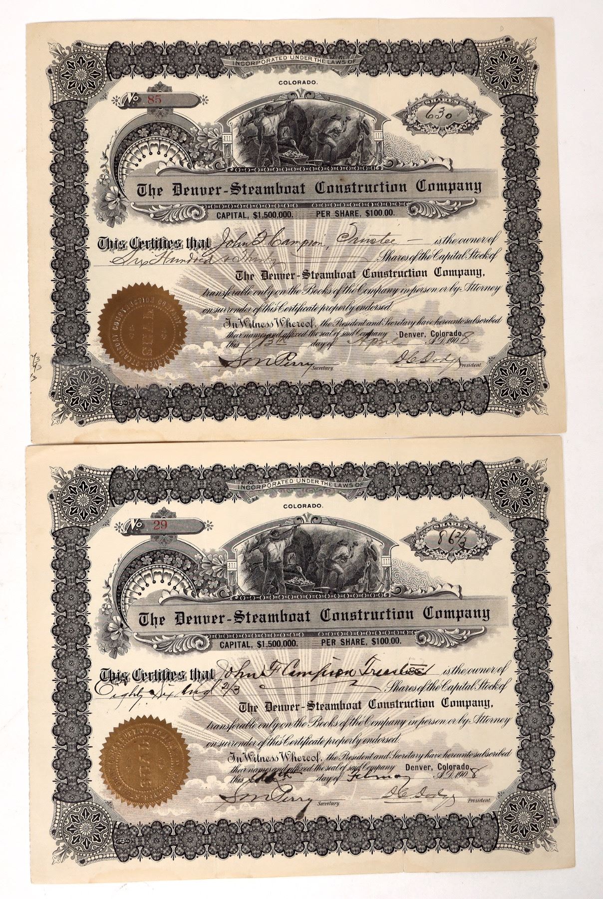 2 issued 1908 Denver-Steamboat Construction stocks. 1 has a .6" lower crease tear. David Child Dodge began his railroad career during 1853 in Illinois at the Chicago and Northwestern Railway. From 1856-1864, Dodge worked on the construction of the Chicago, Iowa and Nebraska Railroad. In January 1864, he was sent to Chattanooga, Tennessee to work in the Commissary Department of the United States Army during the Civil War. He returned to Iowa in October 1864. At that time, Dodge became General Agent for the Chicago and Northwestern Railway. From 1870-1871, Dodge served as a General Agent for Kansas Pacific Railway. Afterwards, he joined Denver and Rio Grande Railway. He worked with William J. Palmer to develop the Rio Grande system. He retired in 1901 to concentrate on other business interests, among them the Shirley Hotel. In 1907, David H. Moffat and his associates persuaded Dodge to work with the Denver and Northwestern Railway to extend the Moffat Railroad from Yarmony to Steamboat Springs. He accepted the position of President of the Denver Steamship Construction Company and returned to railroad building in 1909. Dodge owned the Shirley Hotel and oversaw the operation of his ranch, Shirley Farm
