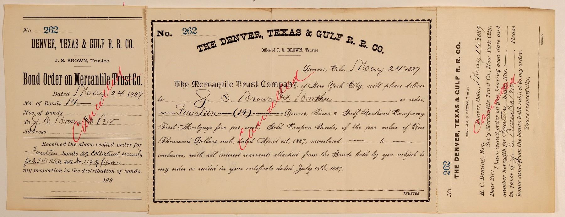 Stock Certificate from the Denver, Texas and Gulf Railroad Co. Certificate number 262 issued in 1887 at Denver, Colorado to J. S. Brown & Brother. Size 8.5 by 6 inches. Good condition. Canceled. Delivery certificate for gold Bonds, certificate unsigned. Formed in 1885 to buy at foreclosure Denver and New Orleans Railroad Company; in 1890 merged into Union Pacific, Denver, and Gulf Railway Company along with other lines.