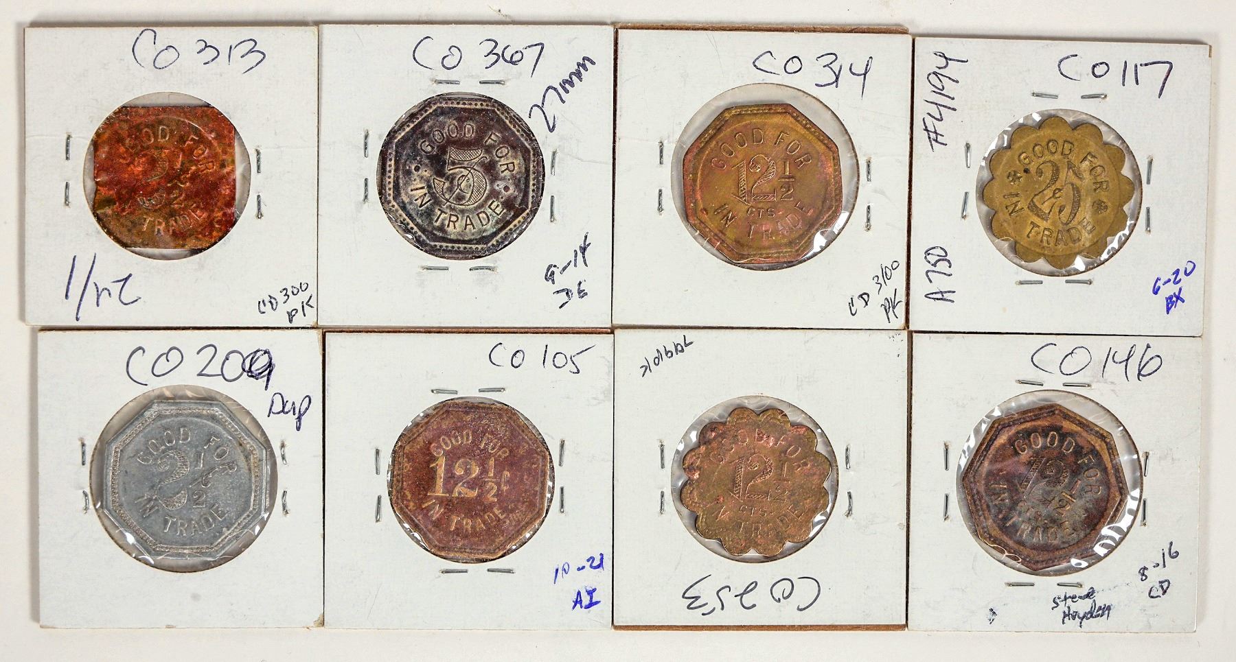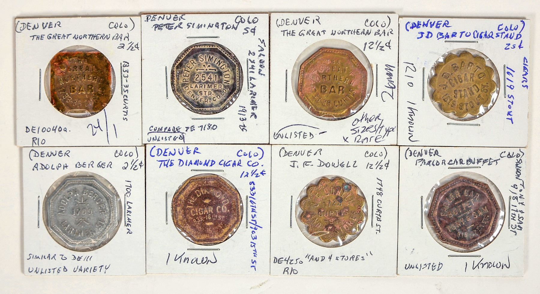 Eight Denver tokens with attractive eye appeal: Parlor Car Buffet; J. D. Barto Cigar Stand; J. F. Dowell; The Diamond Cigar Co.; Adolph Berger; The Great Northern Bar (2 different); Peter Simington.