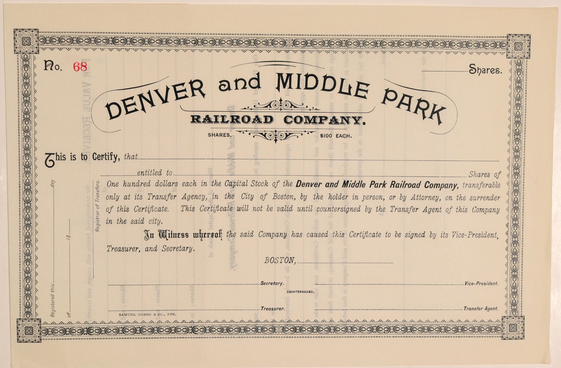 Stock Certificate from the Denver and Middle Park Railroad Co. Incorporated in 1883. Certificate number 68 issued at Boston. Printed by Samuel Hobbs & Co. Size 11.375 by 7.5 inches. In very nice condition. Unissued, intact certificate in black ink on ecru paper. All corners and edges are in original condition with the original fold along the left edge. The D& MPRR operated from 1883 to 1890. Middle Park is a lowland region between ranges of the Rocky Mountains, roughly between Lake Grandby and Kremmling, Colorado.