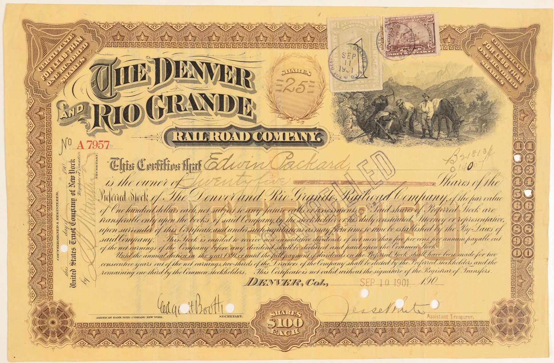 Stock Certificate from the Denver and Rio Grande Railroad Co. Certificate number A7957 issued in 1901 at Denver to Edwin Packard. Signed by Jesse White, and E. Booth. Printed by American Bank Note, size 11 by 7 inches. In nice condition. Canceled. Two documentary stamps. 1) $1 U.S. Internal Revenue documentary stamp. 2) 25 cents 1898 internal revenue stamp. Holes where president and secretary would sign. Vignette in the upper right showing four miners and a horse in the foreground and rugged mountains in the background. Cancelled in 1905 on the reverse which has red and yellow revenue stamps.