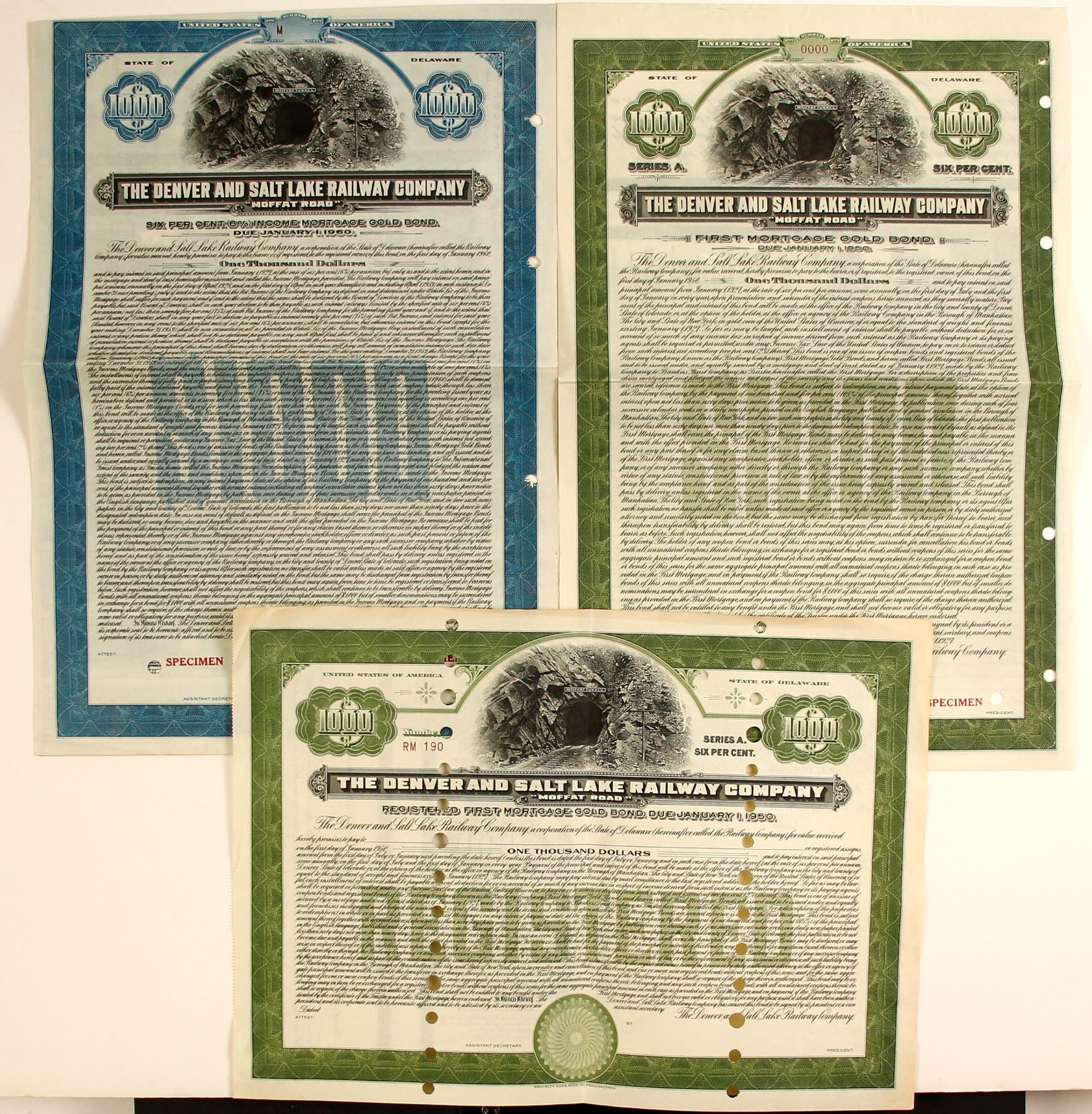 3 bonds for Denver and Salt Lake Railway Company "Moffat Road." Inc. DE. 1) Specimen Trustee's Certificate $1,000 6% Income Mortgage Gold Bond due Jan 1, 1960 including all 33 coupons. Vignette of railroad tunnel with "Moffat Tunnel" on entrance. Blue border and company seal. 2) Specimen Trustee's Certificate # 0000 Series A, $1,000 6% 1st Mortgage Gold Bond due Jan 1, 1950 including all 46 coupons. Vignette of railroad tunnel with "Moffat Tunnel" on entrance. Green border and company seal. 3) Unissued and cancelled Trustee's bond, registered 1st Mortgage Gold Bond due Jan 1, 1950 series A 6%. Green border with green company seal. Denver, Northwestern and Pacific Railway was a U.S. railroad company in Colorado. Company had numerous reorganizations throughout its financially-troubled history and later had the official names of the Denver and Salt Lake Railroad, then Denver and Salt Lake Railway. Company acquired by the Denver and Rio Grande Western Railroad, was known as the Moffat Tunnel Route. Sections in use today known as the Moffat Tunnel Subdivision of Union Pacific Railroad's Central Corridor. Printed: Security Bank Note Co. Phila.