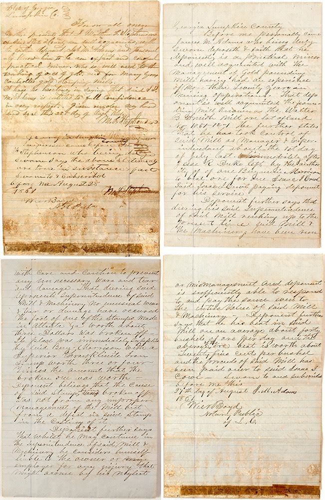 This is a rare Confederate mining letter. The Confederates kept the mints alive only in 1861 and then shut them down. This appears to be an early job application. In it M. L. Stephenson states the reasons that he would be capable of managing a mill. He is well acquainted with the pounding Mill such as the Walter B Smith Mill (belonging to Isaac Cowl?) on Number 1051-12-1. He states the mill processed about 40 bushels a day. He also states he can cover the financial cost of accidents that he is responsible for. There is a lot more. In the deposition Stephenson mentions he is following Jesse R Duke. Duke resigned to join the Confederate army as he enlisted in 1861 at BIg Shanty. On June 23, 1863 he had risen to rank of Captain. He was released from duty in 1864 due to illness. Four legal sized pages. Some fading on back page make it hard to read. (Al Adams Gold Rush Memorabilia Collection) Date: 1861 Location: Lumpkin County, Georgia HWAC# 57069