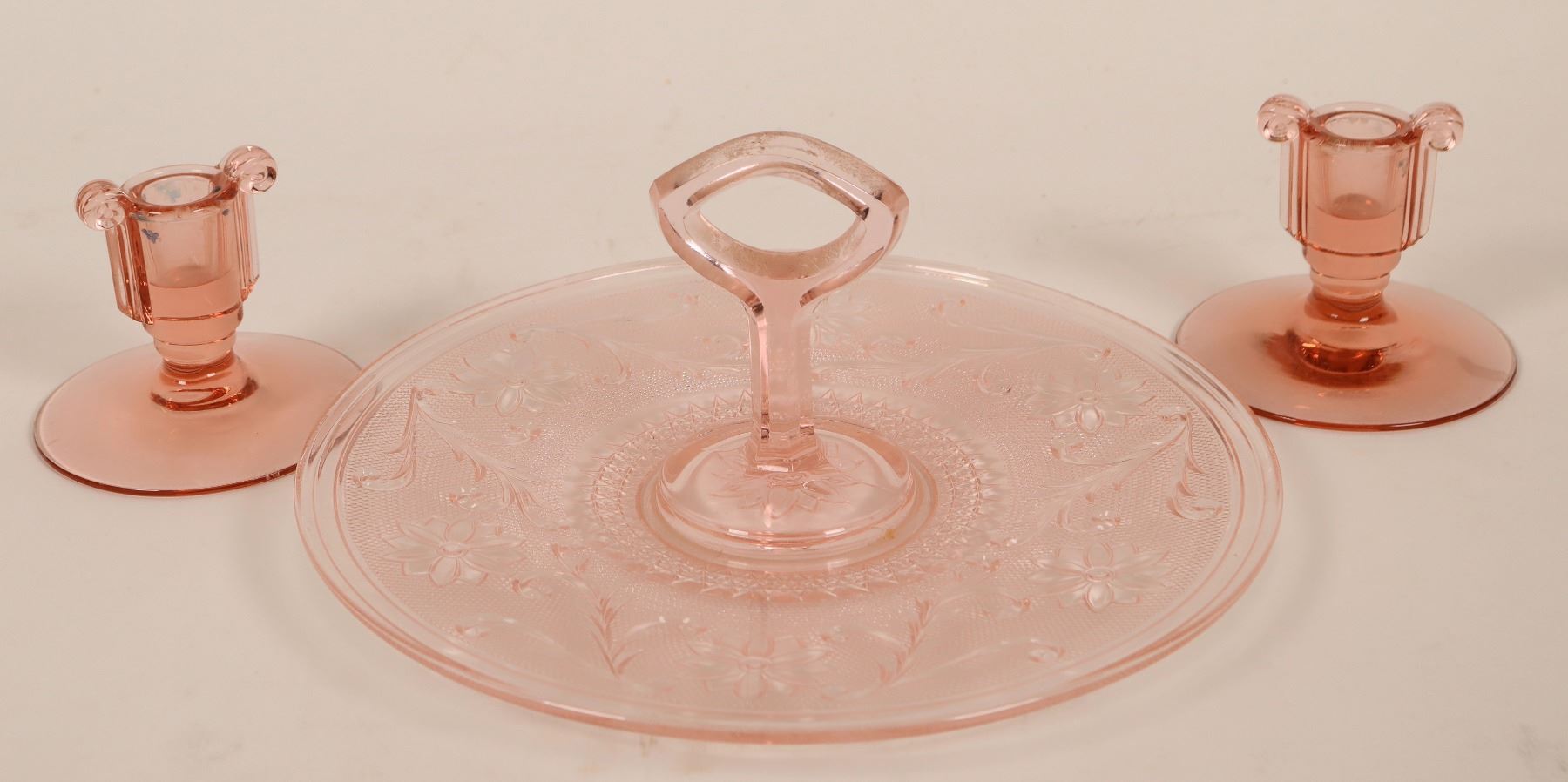 Three pieces of Depression glass, including two candlestick holders measuring 3"x 4". There is also a serving dish that measures about 12" across. No apparent damage, cracks or chips. See photos for more information. Date: 1930's Country (if not USA): State: City: Provenance: John Reynolds Collection