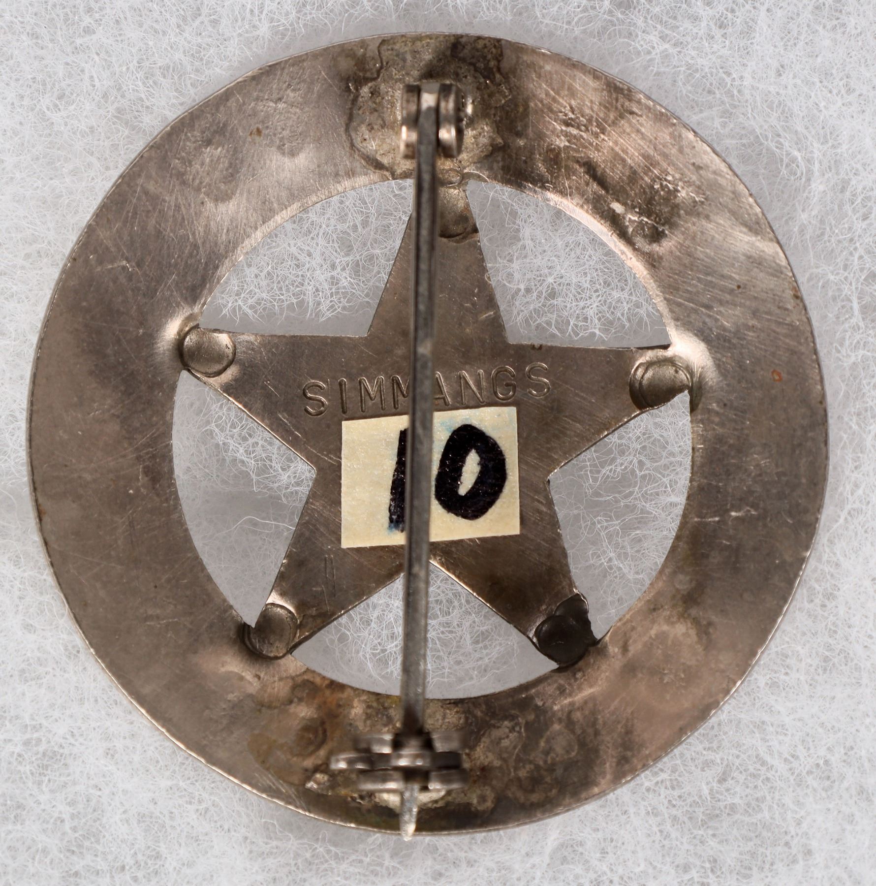 Nickel plated 5 point circle star Deputy Sheriff badge. Hall marked Simmang's, possibly San Antonio. Ex George Jackson Estate. 1.75" with pinback.