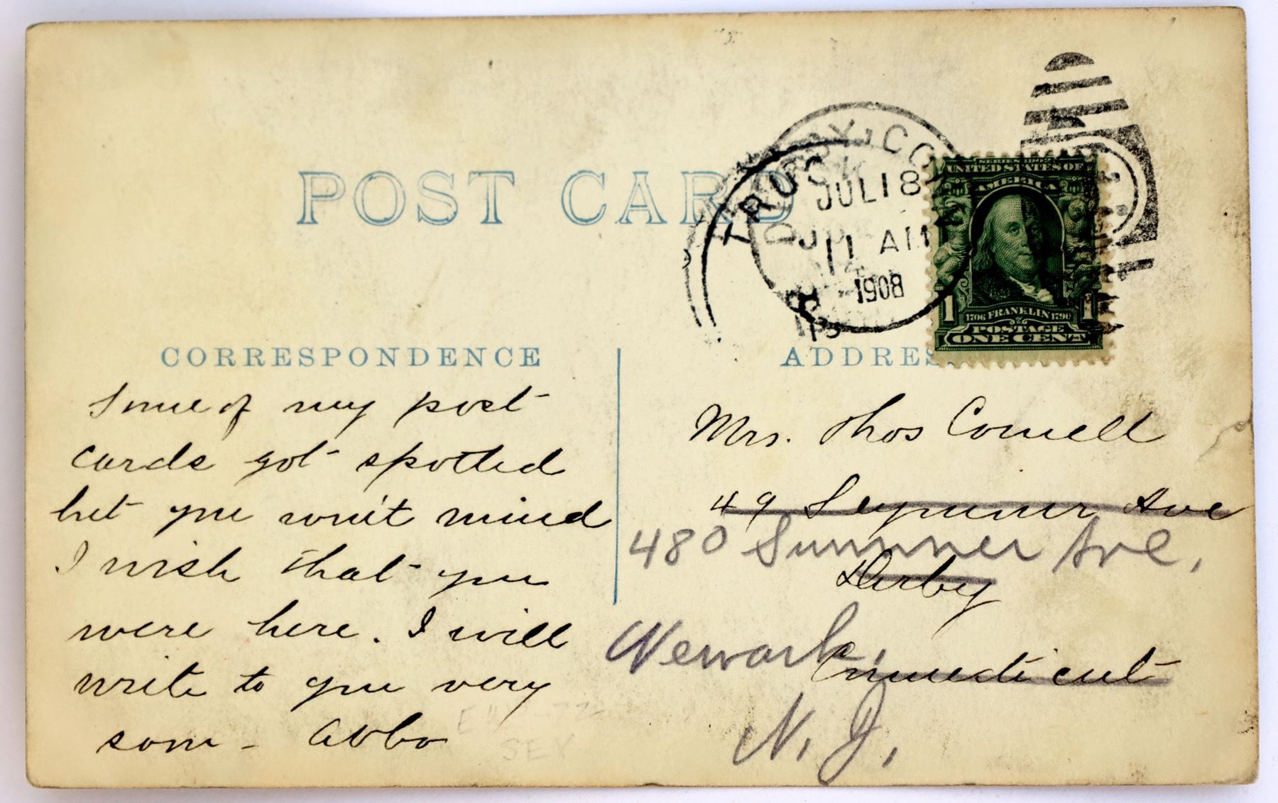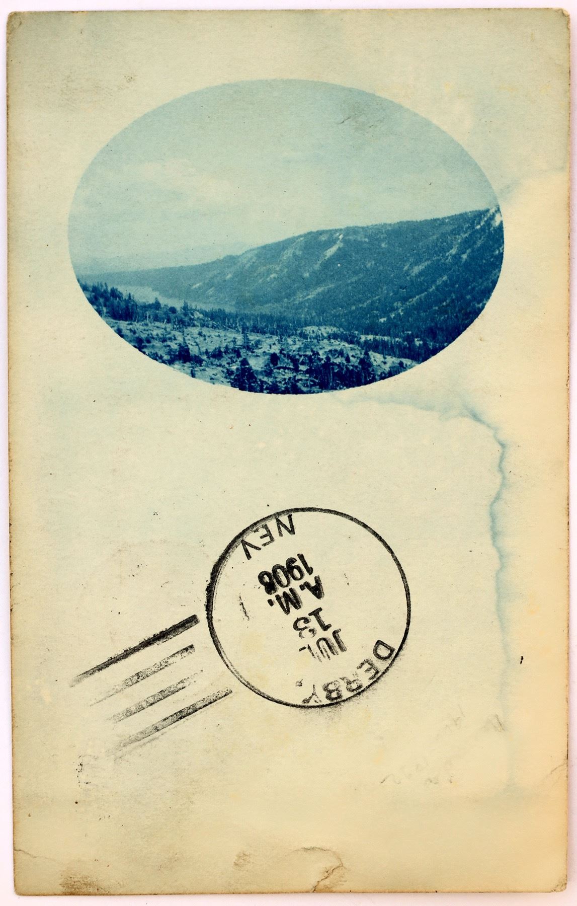 Rarity-5. Excellent strike. 1908. Postcard has an oval blue cyanotype of the mountains and a valley - obviously near Truckee where this was sent from. This postcard was sent from Truckee, California to Derby. Derby, Nevada was just up the Truckee River from Truckee, California, so the post office sent the letter to Derby, Nevada. But it is clearly marked as Derby, Connecticut, so the postmaster at Derby, Nevada applied his cancel and sent it on its way. Photo probably in the Truckee, California aera.