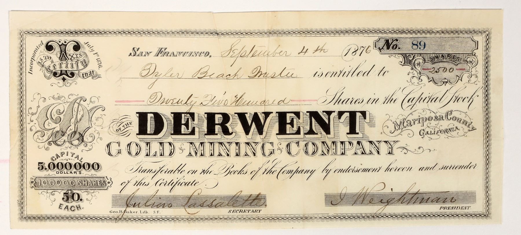 Rare; we've never offered this before. "Mariposa County, California" printed at right. Inc. July 1876. No. 89, issued for 2500 shares in 1876 in SF to Tyler Beach. Signed by president Weightman and secretary Lassalette. Not cancelled. Geo. H. Baker Lith. Folds, creases. 4.25 x 9.5" No additional information located on newspaper databases or online.