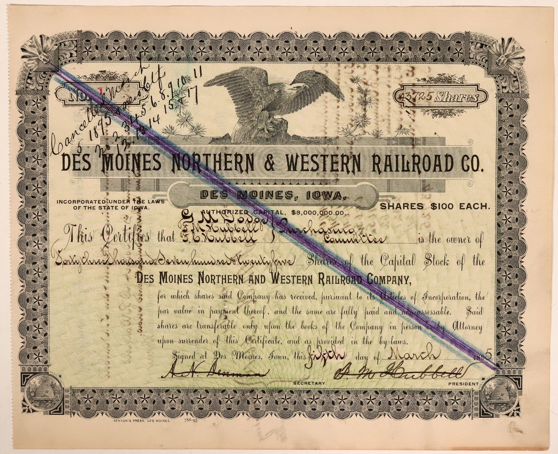 Very rare stock certificate from the Des Moines Northern & Western Railroad Co. issued in 1895. Certificate #1, issued to the Purchasing Committee: G.M. Dodge, F.M. Hubbell and F.C. Hubbell for 43,725 shares, more than half the 80,000 authorized shares. Signed by F.M. Hubbell as president and A.N. Denman as secretary. This certificate was the controlling interest in the company. The three members of the Purchasing Committee have endorsed this certificate on the back including G.M. Dodge. Dodge was railroad executive for the Union Pacific and helped direct construction of the transcontinental railroad in the 1860's. He also was a military officer for the Union in the Civil War and a pioneering figure in military intelligence (wiki). Diagonal blue line cxls. the certificate. Listed in Cox. VF.