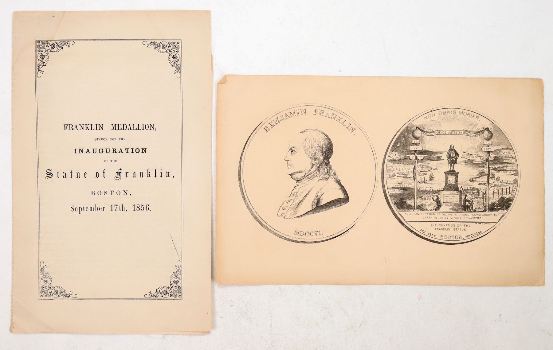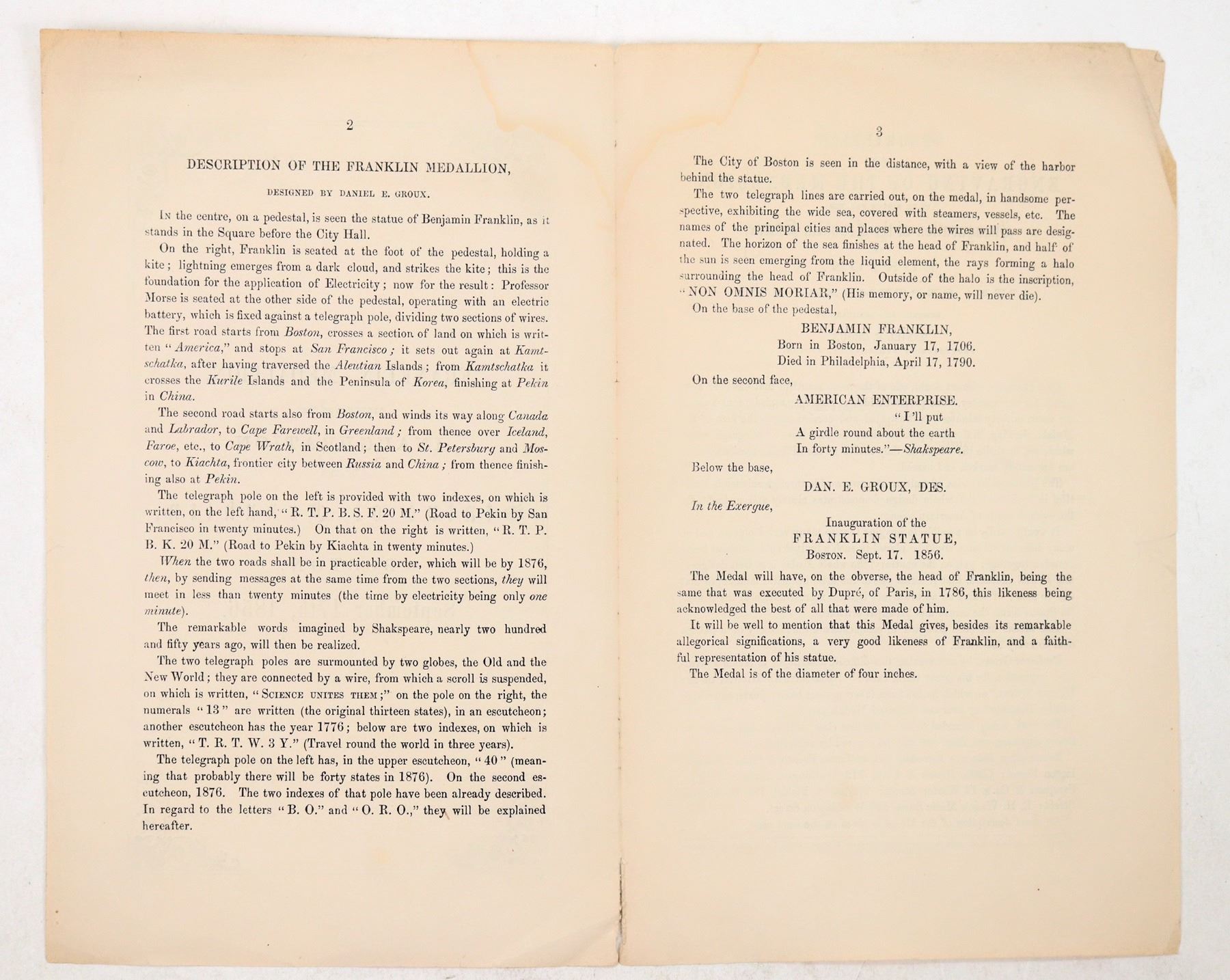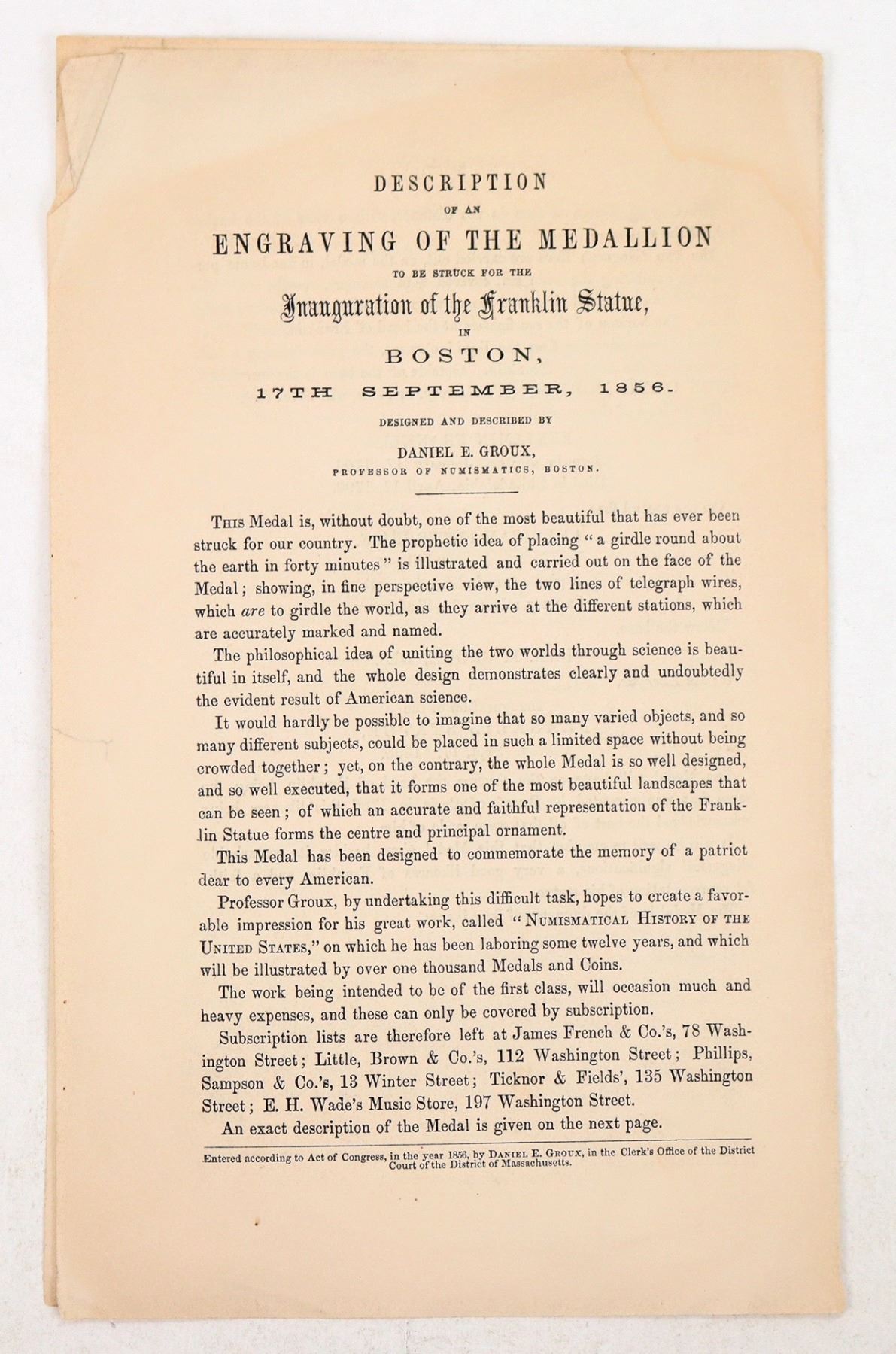 A description of an engraving of the medallion to be struck for the Inauguration of the Franklin Statue in Boston September 17, 1856. According to Dick Johnson, the medal was never struck. Two page flyer (6 x 9 inches) and facsimile of the proposed medal.