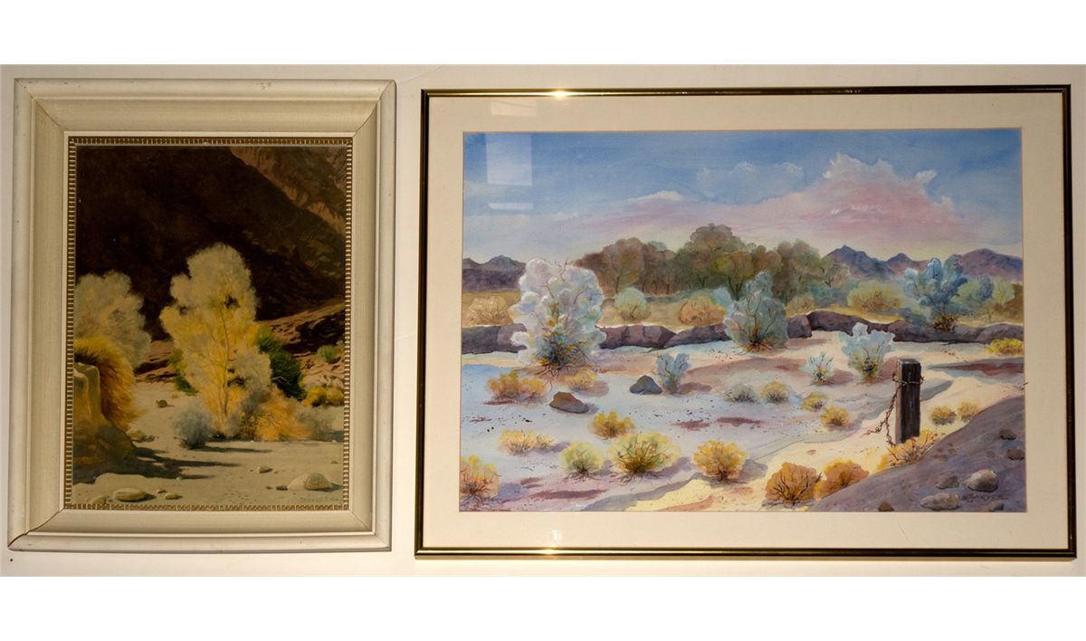 Pair of gorgeous framed western art. 1) Watercolor by Mary Lou Sawyer titled "Desert Sunrise." Measures 27" x 20" in matte and frame. 2) Framed print of a painting by S. Winnerton titled 'Desert Arroyo." Measures 16" x 20" in frame.