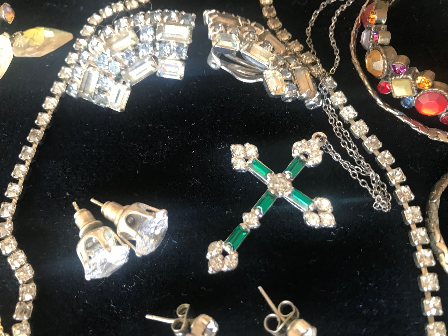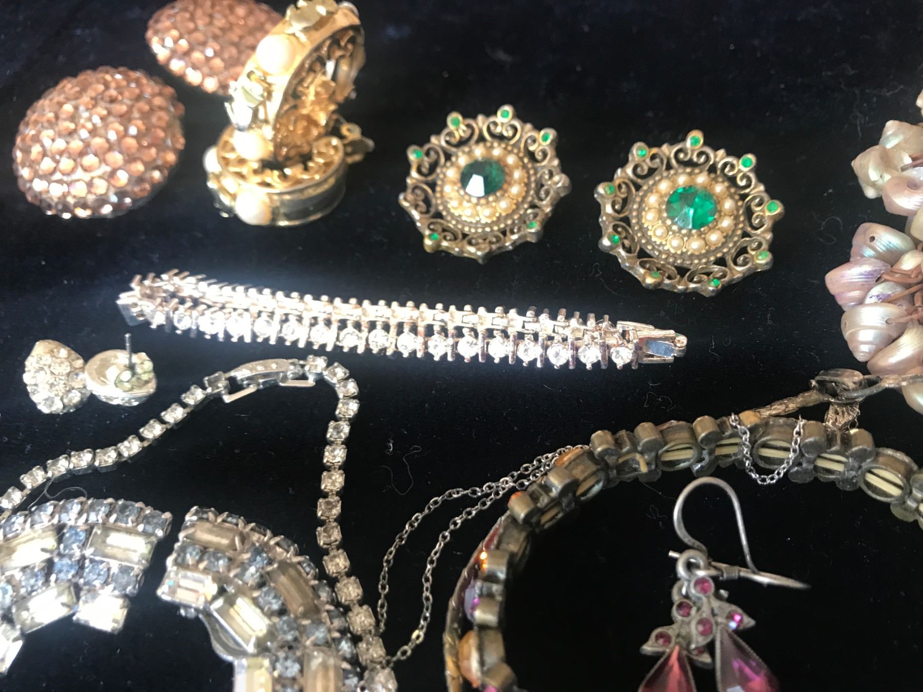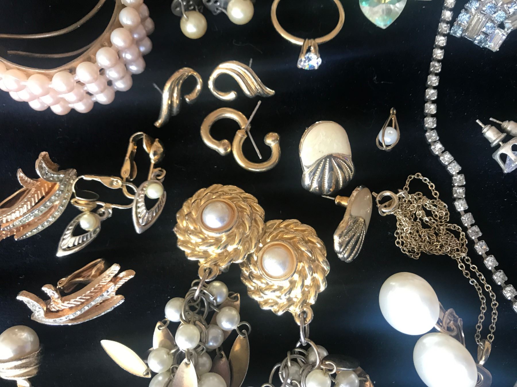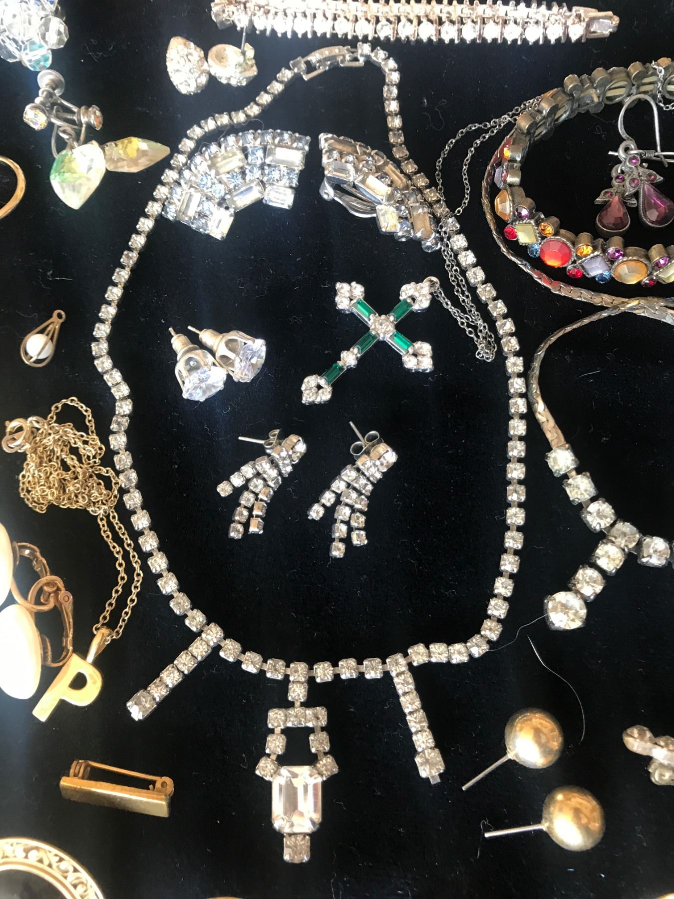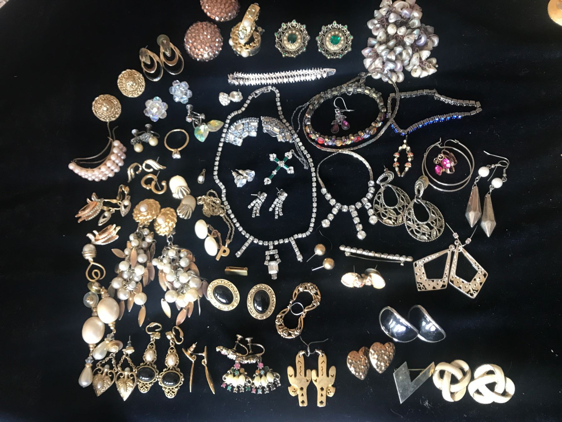 Over 50 pieces of jewelry (earring pairs counted as one) all matching pair earrings, and everything in good repair. Maybe missing earring backs. Collectible Designers, rhinestones, faux pearls, semi precious gem stones, zirconia, gold plate, gold fill, silver plate. Vintage clip ons and screw backs, Swarovski crystals. Nice variety of styles and eras represented.