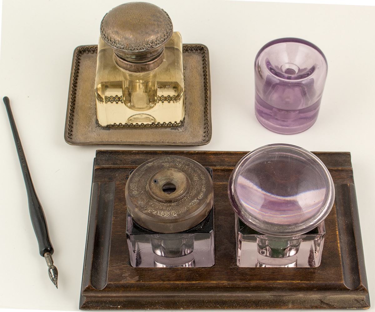Desktop inkwell collection. Four different desktop inkwells, three with original fitted bases. All from the collection of Reno attorney Wayne Mortimer. Two of the inks are in a custom fitting stand, The Sengbusch Self-closing Inkstand. Mr. Mortimer used a glass paperweight for the top of one of the inkwells. City: State: Inventory Number: 38979