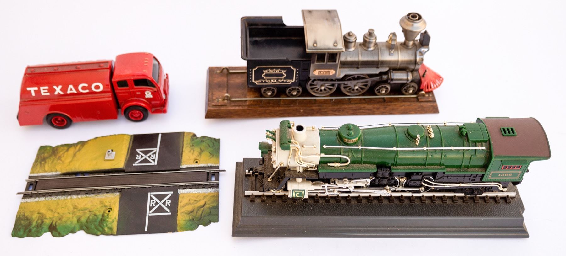 lot of 3. 1. Metal Steam Locomotive #1864 - Electric Gas Lighter Set. Produced by Windmill in Japan (not tested). 2. Telemania Atlantic Locomotive TELEPHONE RR 1925 train novelty tone pulse GTE phone. 3.White Motor Company 1949 Tilt Cab Texaco Fuel Tanker Red Series #13 8+ metal bank. State: City: Date:1970-90's Provenance: