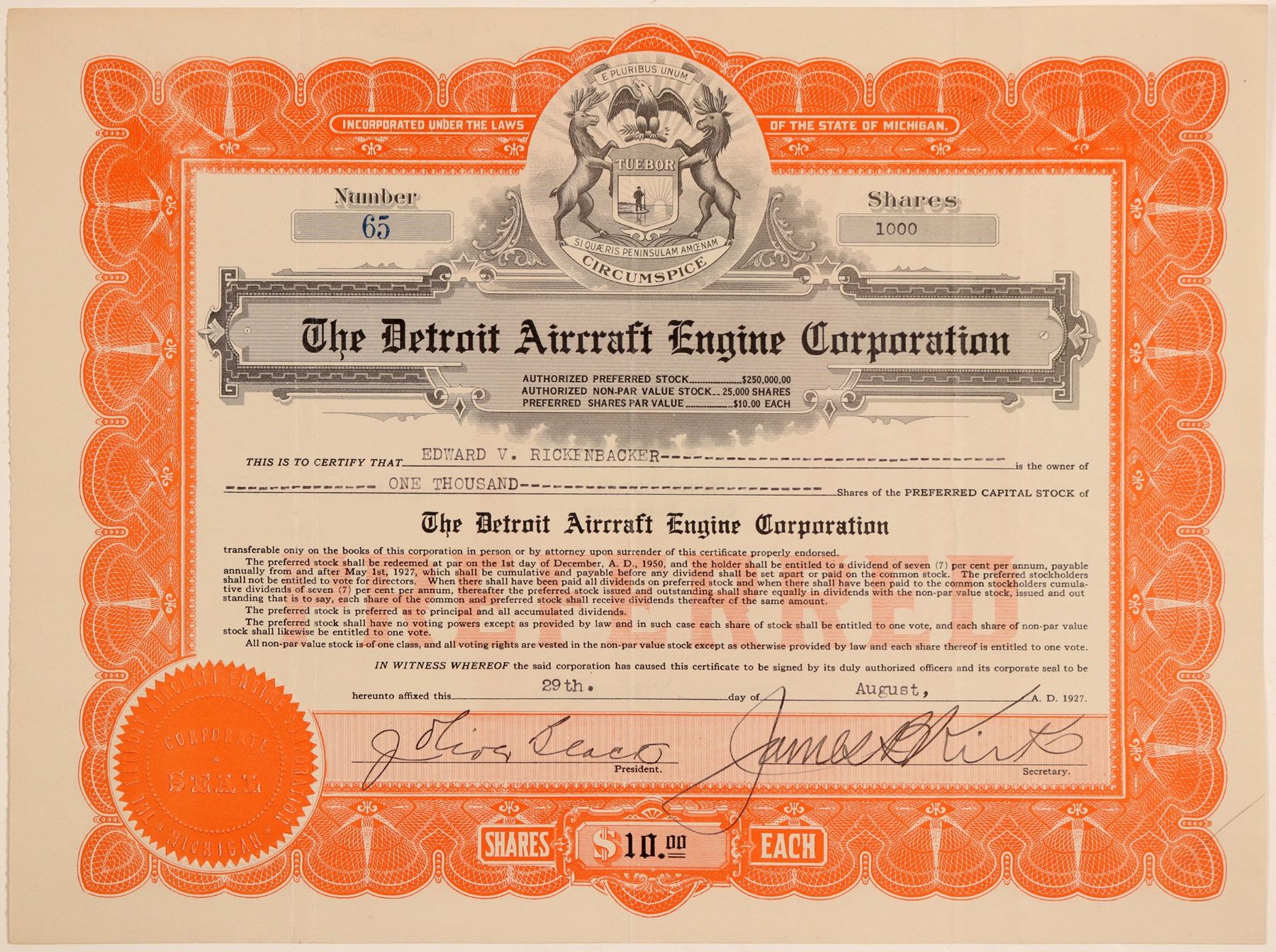 Inc. in Michigan. No. 65, issued for 1,000 shares to WWI fighter pilot hero Edward V. Rickenbacker on August 29th, 1927. Signed by president J. Black and secretary James Kirk. Not endorsed by Rickenbacker. Not cancelled. Orange border, black print, Michigan state seal vignette. Folds. 8.5 x 11.25" The company built the Air Cat in 1926. Purchased by the R. K. Le Blond Machine Tools Co. in 1927 and formed The Le Blond Aircraft Engine Corporation of Cincinnati, Ohio. Originally known as the Detroit Air Cat Engine Company, founded in 1925 by Rickenbacker. Ken Prag Collection