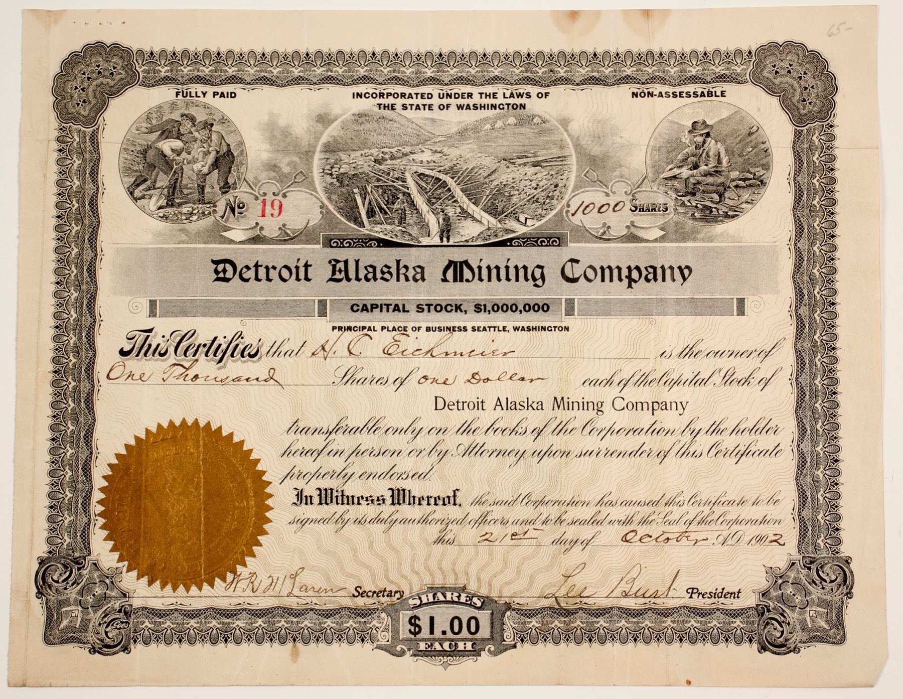 One thousands shares of Detroit Alaska Mining Company, number 19 issued to H. C. Eichmeier, dated October 21, 1902. Signed by Lee Burt, president. W. R. Laren, secretary. Incorporated under the laws of Washington state. Three mining vignettes, with gold seal. Ken Prag collection. State: Alaska City: Date: HWAC# 82376