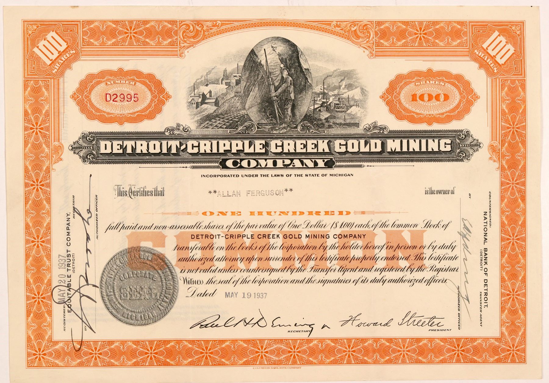 Rare. Inc. in Michigan. No. D2995, issued for 100 shares to Allan Ferguson on May 19, 1937. Printed signatures of president Howard Streeter and the secretary. Not cancelled. Orange border, black print, and elaborate vignette showing multiple mines with a cut-out showing a miner using a drill. Printed by Columbian Bank Note Co. Folds, light wear. 8 x 11.25" Not listed in Hills. Cripple Creek Colorado Ken Prag Collection