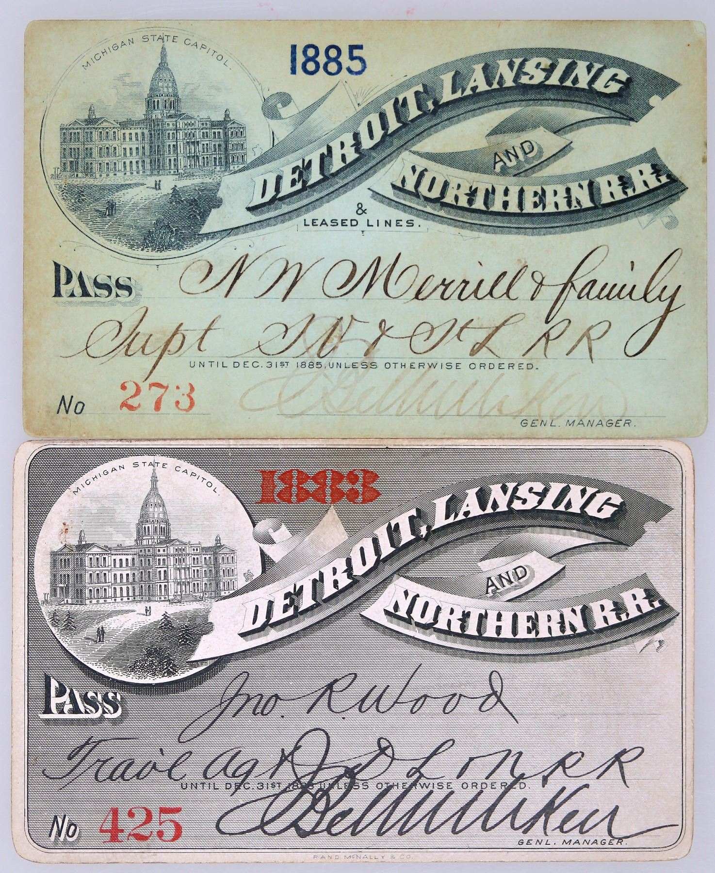 Lot of 2. 1) Pass no. 425 issued for 1883 to John R. Wood. Signed by the general manager (illegible). Black and white print with vignette of the Michigan State Capitol building. Reverse has map of the route! Printed on cardstock. 2) Pass no. 273, issued for 1885 to NW Merrill & family. Signed by the general manager. Black print on green cardstock. Same capitol building vignette and map on reverse. Toning/soiling. Operated 1876-96. Took over the defunct Detroit, Lansing and Lake Michigan Rail Road. Later became part of the Pere Marquette Railway.