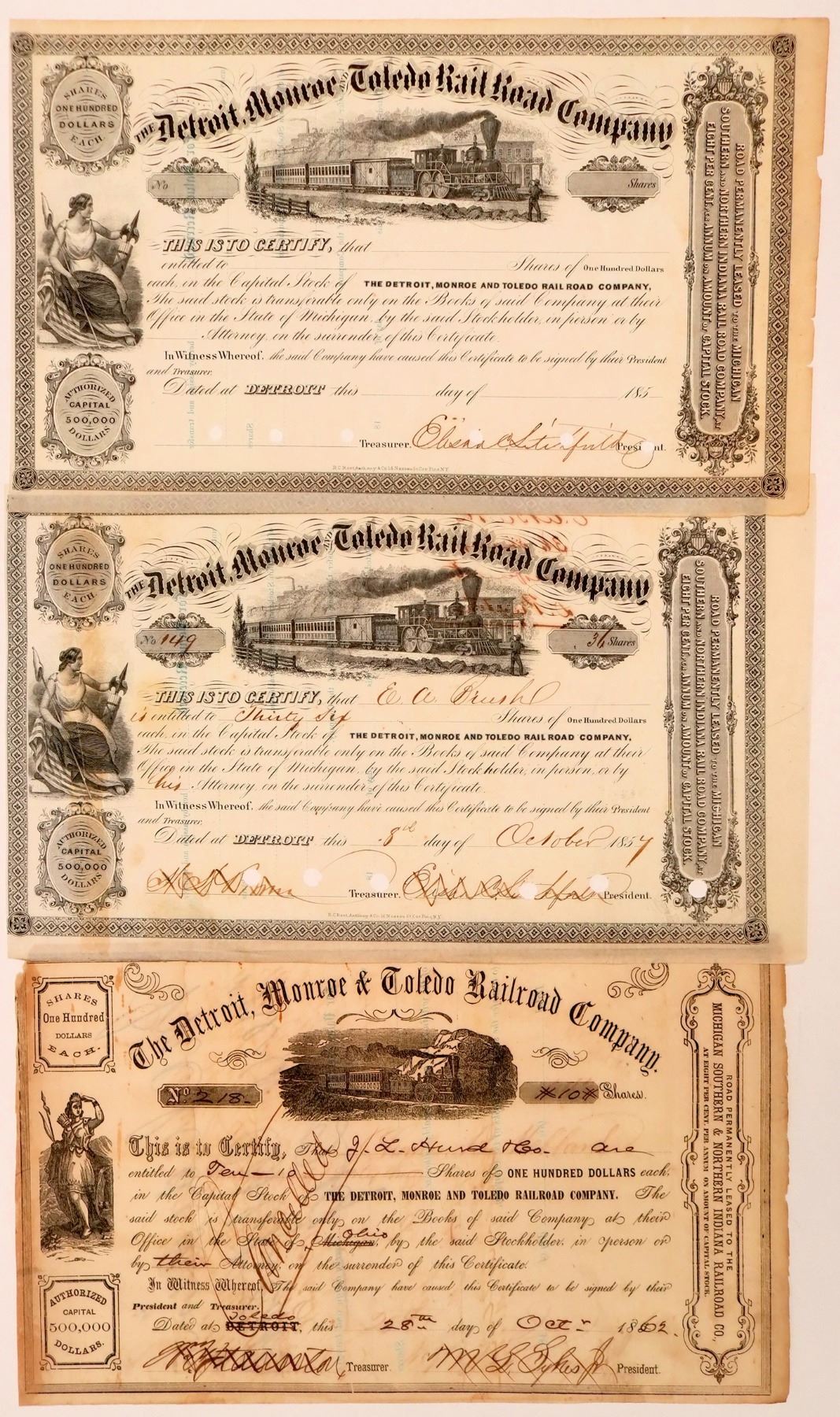 3 stock certificates from the Detroit, Monroe and Toledo Rail Road Company. One issued in 1857, one issued in 1862, and one unissued from the 1850's but signed by the company president. The two issued certificates have different vignettes and both are hole or pen cxled. or both. This variety is listed in Cox. 1862 certificate has small piece missing from top left corner.