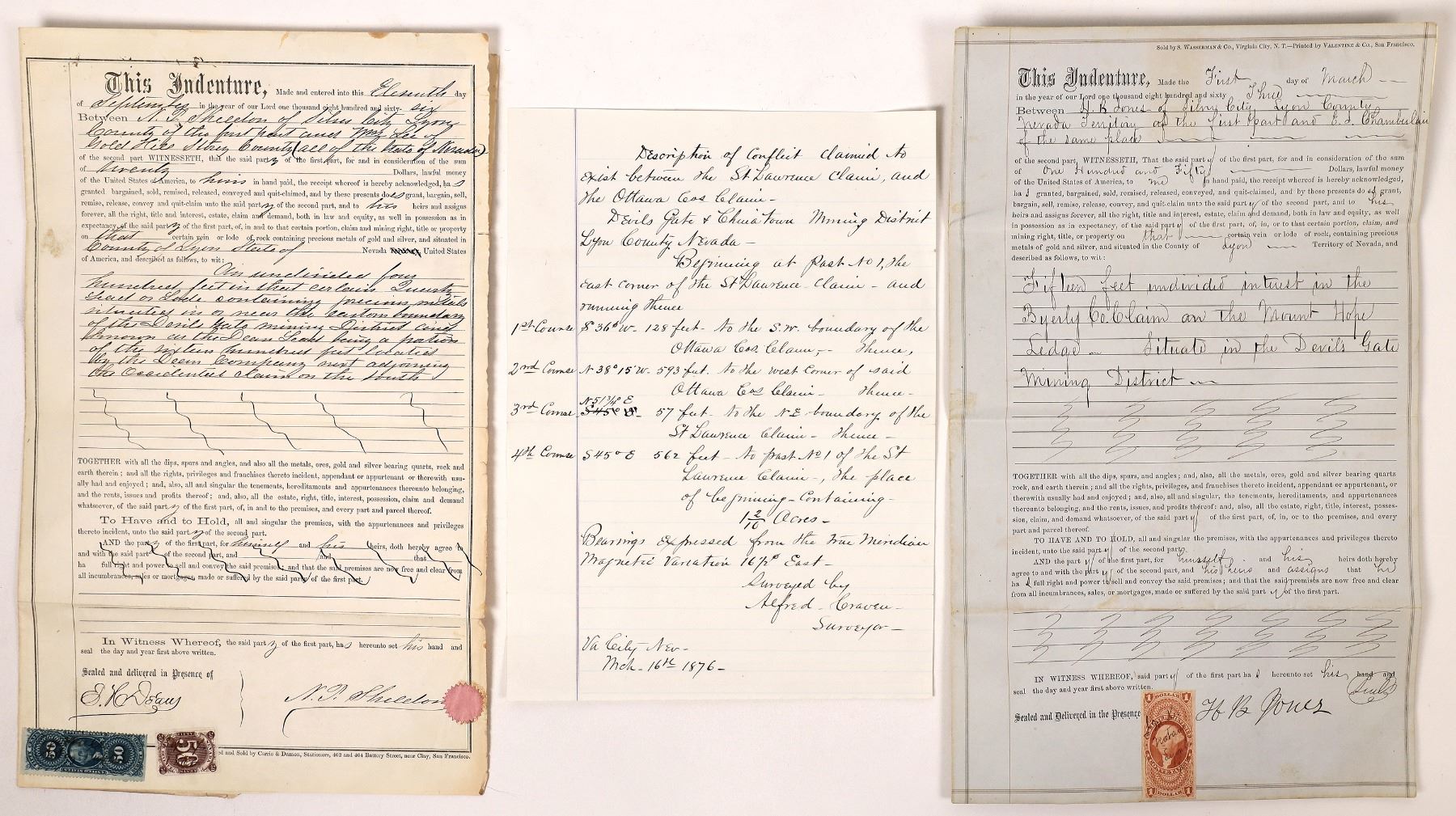 Lot of 3 different. The Devils Gate Mining District was located at Silver City, Nevada. 1) 1863 (territorial) indenture between HB Jones of Silver City and EL Chamberlain for 15 undivided feet interest in the Byerly Co. Claim on the Mount Hope Ledge in the Devil's Gate Mining District. Signed by Jone. $1 US IR Conveyance stamp. Sold by local printer S. Wasserman & Co., Virginia City, NT. Company not listed in Collins. 2) 1866 deed between NP Sheldon and William Lee for 400 undivided feet on the Deem(?) Lead near the boundary of the Devils Gate district. SF printer. 50 cent brown Nevada and 50 cent blue UC IR adhesive revenue stamps. 3) One page description of survey by Alfred Craven, Virginia City, 1876, to describe the conflict claimed to exist between the St. Lawrence claim and the Ottawa Co. Claim in the Devils Gate & Chinatown Mining Districts of Lyon County, Nevada.